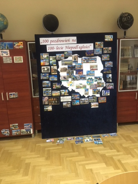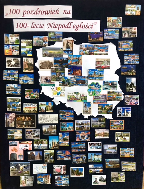 przesłanie stu szkołom w stu miastach Polski pozdrowień z okazji tego święta. Otrzymując kartki z pozdrowieniami uczniowie zamieszczali je na mapie Polski. Efekty tej pracy mogliśmy zobaczyć na tablicy podczas apelu 9 listopada.