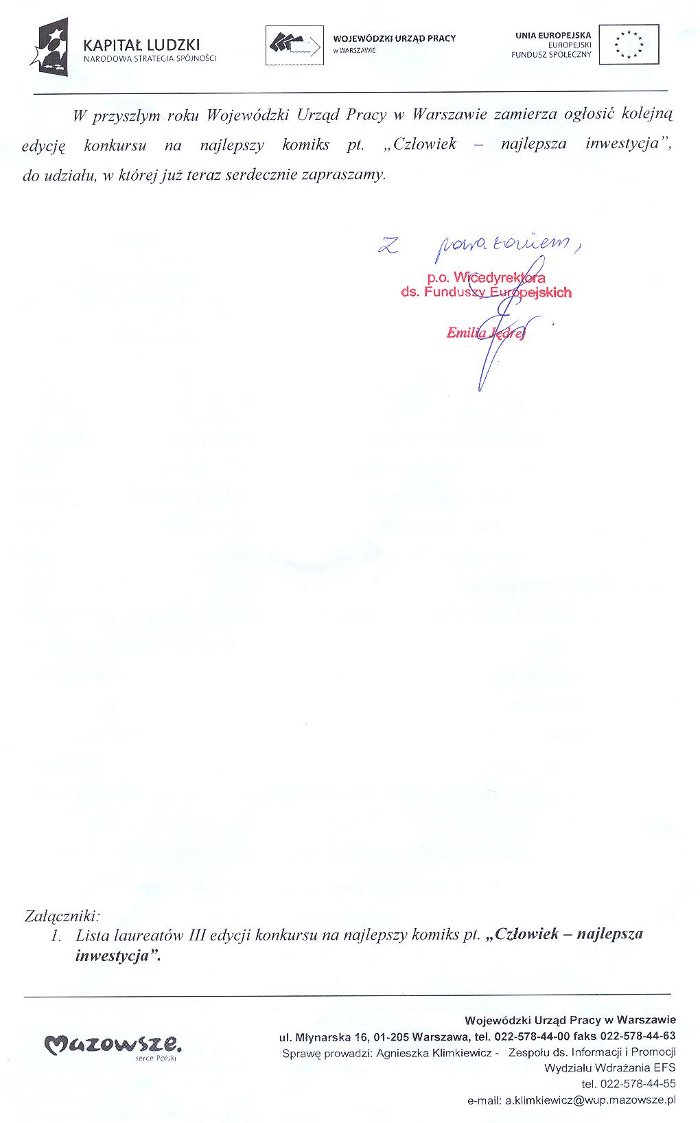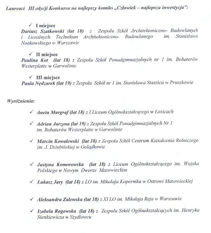 11 grudnia 2011r. – konkurs na najlepszy komiks „Człowiek – najlepsza inwestycja”. admin | 11 grudnia 2011 | 2011/12, Kronika | Brak komentarzy Uczeń naszej szkoły Łukasz Jary uzyskał wyróżnienie w konkursie zorganizowanym przez Wojewódzki Urząd Pracy na najlepszy komiks pt. „Człowiek – najlepsza inwestycja”.