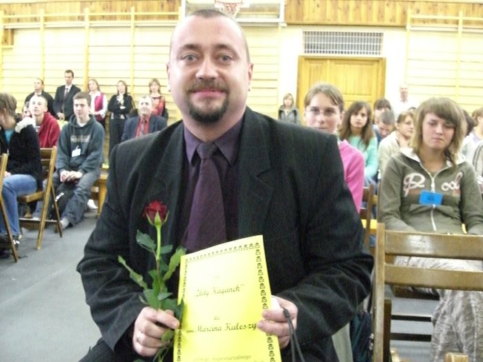 W tym szczególnym dniu uczniowie także wyrazili swoją wdzięczność uczącym ich profesorom – przygotowali uroczystość, na której były rozdawane Uczniowskie Oskary. Złoty Mikrofon otrzymała p. Anna Malec, Złoty Wykładowca – p. Bożena Nowak, Złoty Pazurek- p. Beata Przeździecka, Debiut Roku – p. Cieśluk, Bratnia Dusza – p. Małgorzata Kośnik, Luzak Roku – p. Piotr Chud, Złota Katarynka – p Małgorzata Wiercińska, Szwajcarski Zegarek – p. Krzysztof Studnicki, Żartowniś Roku – p. Marek Kuczyński, Gorący Uśmiech – p. Małgorzata Skrajna oraz najważniejszą nagrodę – Złoty Kaganek otrzymał p. Marcin Kulesza. Galę prowadzili Krystian oraz Ola. Wszyscy wyróżnieni dostali pamiątkowe dyplomy oraz czerwone róże. Również Samorząd Szkolny nie zapomniał o naszych wspaniałych profesorach. Każdemu podarował słodki upominek w postaci czekoladki.