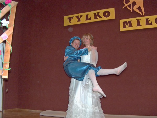 Najważniejszą częścią tej imprezy była jednak niezaprzeczalnie inscenizacja o znanym wszystkim tytule „Romeo i Julia”, a raczej jej modyfikacja. Scena Balkonowa była istnym mistrzostwem! Już samo dobranie obsady na zasadzie, hmmm… kontrastu? było strzałem w dziesiątkę. A aktorzy, trzeba przyznać, byli świetni. Niedostępna i wybredna Julia oraz główkujący jak by tą uroczą niewiastę zdobyć Romeo, wywołali na niejednej twarzy łzy… śmiechu! Długą drogę, od romantycznego kochanka po gorrrącego macho musiał przebyć nasz bohater aby choć odrobinę skruszyć twarde jak orzech serce swej wybranki. W końcu jednak doczekaliśmy się happy end’u – Julia zeszła z balkonu na ziemię i rzuciła się w ramiona rozanielonego Romea… to znaczy… właściwie to on wskoczył się jej na ręce ale w końcu mamy równouprawnienie? czyż nie? Ta wzruszająca scena zaowocowała tańcem triumfującego kochanka i jego damy serca. Tańcem, będącym połączeniem kroków dostojnych z elementami tańca dyskotekowego – efekt by rozbrajający! Na scenie zrobiło się tak gorąco, że o mały włos Romeo nie pogubił swoich podkolanówek… A z resztą – owacje publiczności mówiły same za siebie.