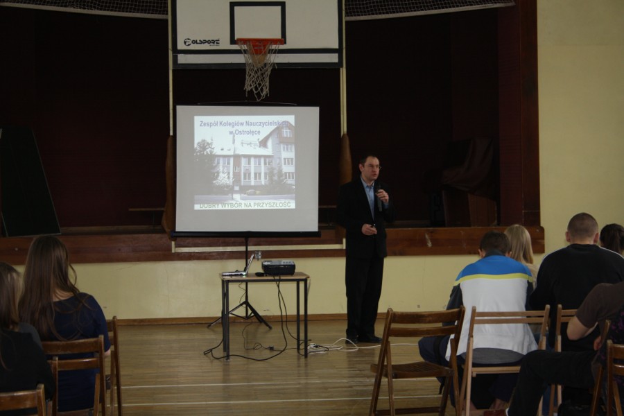 W dniu 16 marca naszą szkołę odwiedzili przedstawiciele Zespołu Kolegiów Nauczycielskich z Ostrołęki. Przyjechali oni do nas, by przedstawić swoją ofertę edukacyjną. W spotkaniu udział wzięli uczniowie wszystkich klasa III. Spotkanie rozpoczęło się o godzinie 10.55 i trwało prawie całą godzinę lekcyjną. Pan dr hab. Krzysztof Łojek opowiedział naszym maturzystom o misji kolegium, bazie lokalowej, rekrutacji oraz specjalnościach, które Kolegium proponuje. W tej szkole uczniowie mogą zostać słuchaczami następujących kierunków: język angielski, język niemiecki, język polski, edukacja wczesnoszkolna oraz pedagogika. Opiekę naukową nad poszczególnymi specjalnościami sprawują Uniwersytet Warszawski oraz Uniwersytet Przyrodniczo- Humanistyczny w Siedlcach. Po ukończeniu szkoły słuchacze otrzymują dwa dyplomy – Dyplom ukończenia Kolegium Nauczycielskiego w Ostrołęce oraz dyplom jednego z dwóch uniwersytetów patronujących ZKN. Zostaliśmy obdarzeni nie tylko plakatami i ulotkami ale także upominkami. To bardzo miły gest ze strony Kolegium. Serdecznie dziękujemy za przybycie z Państwa ofertą do naszej szkoły.