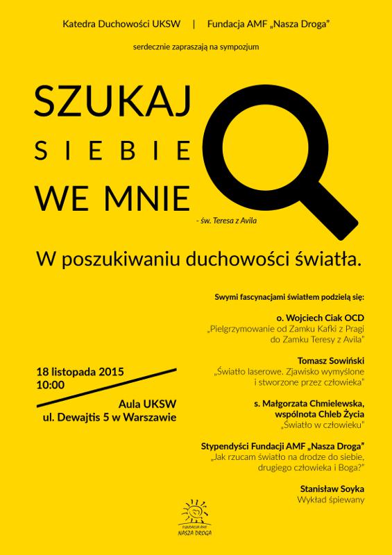 18 listopada 2015 – sympozjum na UKSW admin | 18 listopada 2015 | 2015/16, Kronika | Brak komentarzy 18 listopada 2015r. w Auli UKSW odbyło się sympozjum „Szukaj siebie we mnie – w poszukiwaniu duchowości światła”. Sympozjum było zorganizowane przez Katedrę Duchowości UKSW i Fundację AMF Nasza Droga. Zdjęcia Martyna Rukat