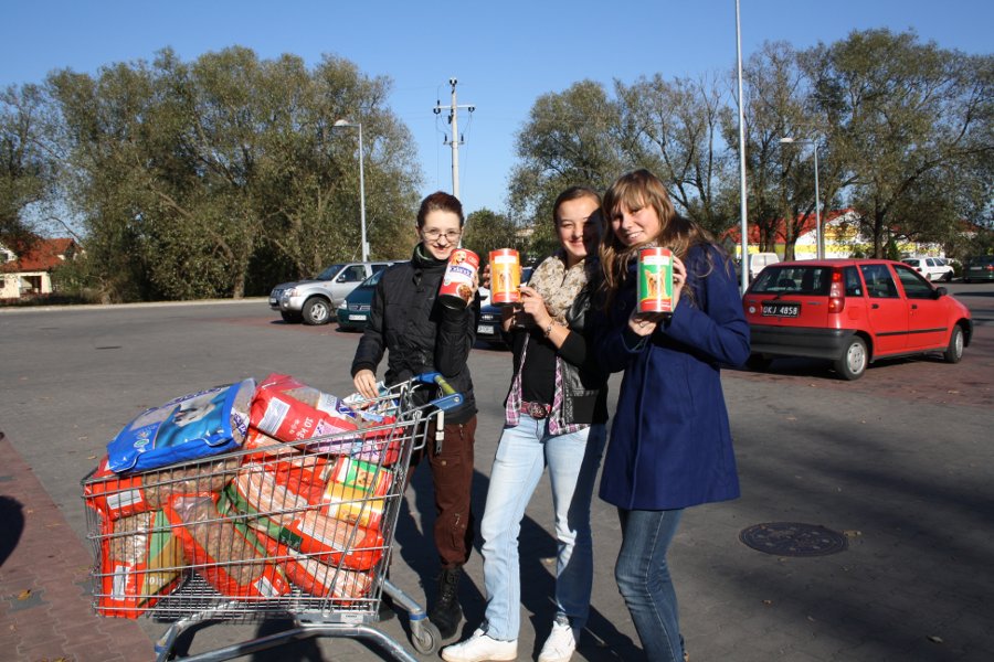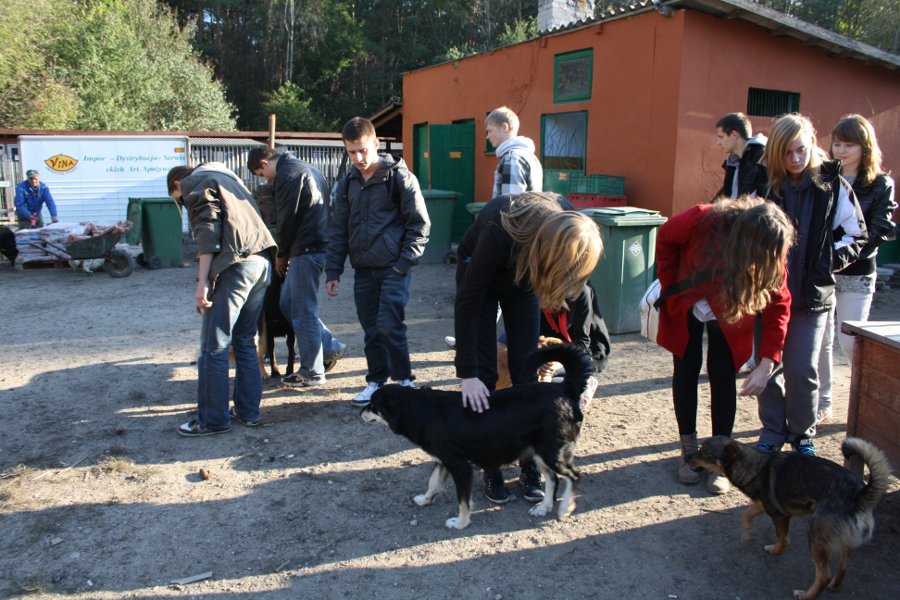 18 października 2011r. po godz. 14.00 my, wolontariusze, wybraliśmy się wraz z panią Magdaleną Konrad do schroniska na Bąkówce. Pogoda okazała się łaskawa, całą drogę świeciło słońce, dzięki temu u każdego z nas zagościł uśmiech na twarzy. Na miejscu przywitała nas gromadka podopiecznych pod nadzorem opiekuna, pana Sławomira Suchty. Nie przyjechaliśmy tam z pustymi rękoma, mieliśmy ze sobą prezenty m.in. karmę i miski. Pracownicy schroniska szybko wzięli się za rozładunek prezentów, których było naprawdę dużo. Dwie pełne taczki karmy wydawały się wielkie, jednak zmieniliśmy zdanie, kiedy pan Sławomir pokazał nam magazyn, w którym było osiem ton karmy.