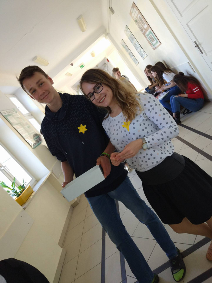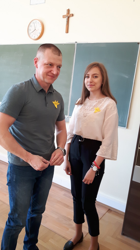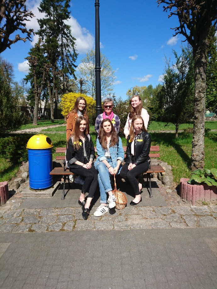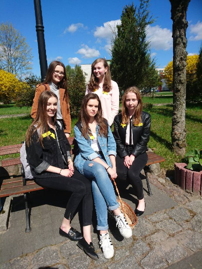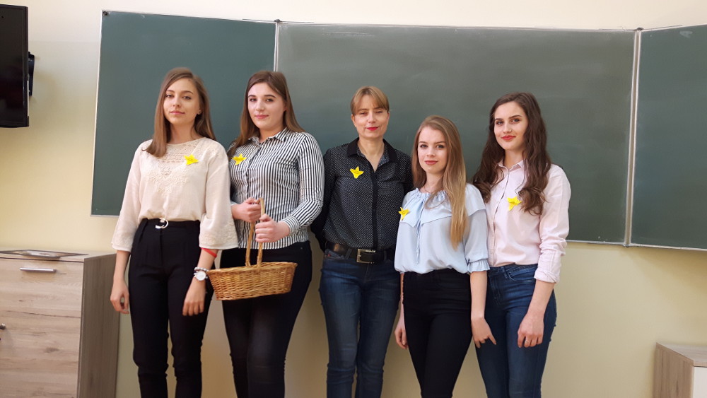 Wolontariuszki i wolontariusze z klas: 1c, 1d, 2d wyszli na ulice miasta, by, wręczając ostrowianom  żonkile, przypomnieć im w rocznicę rozpoczęcia powstania o tragicznej historii getta warszawskiego.