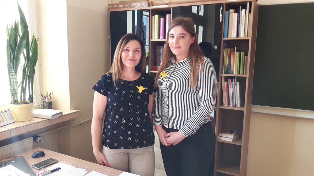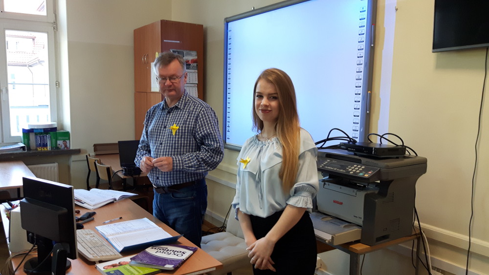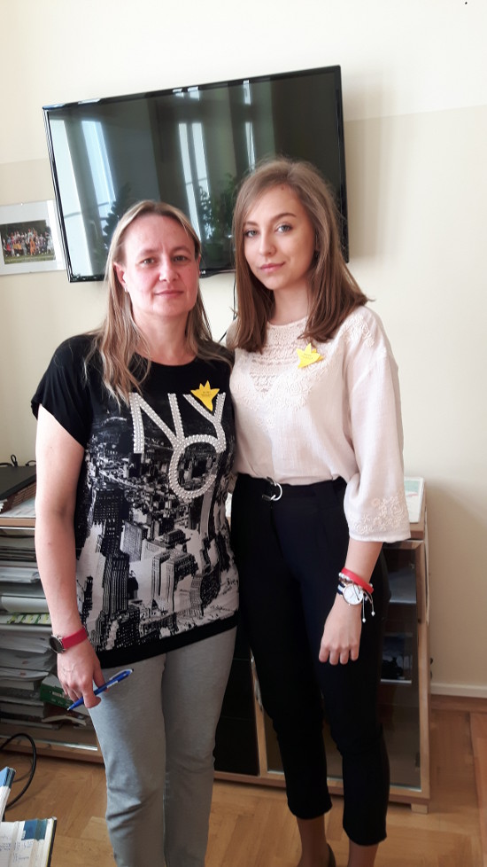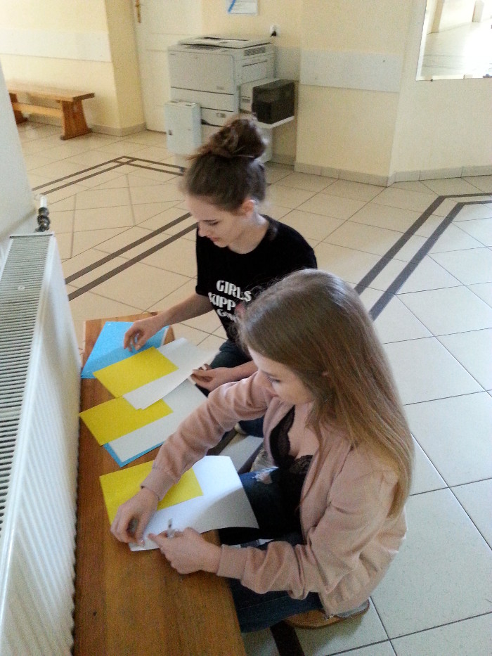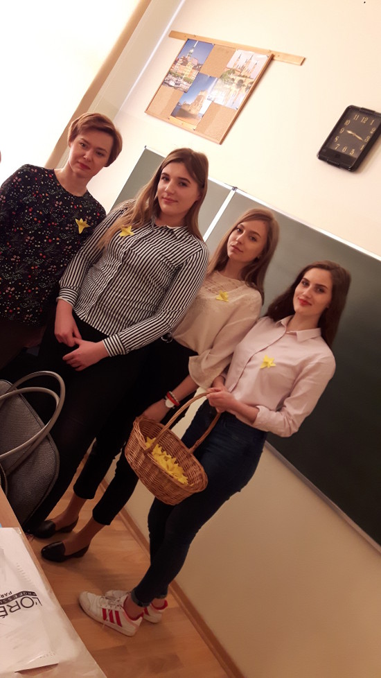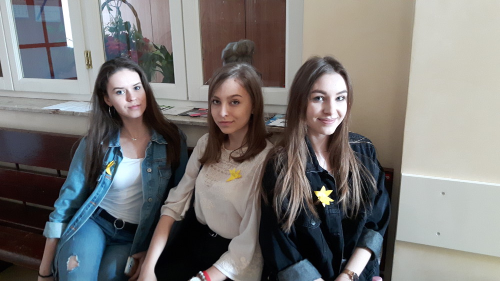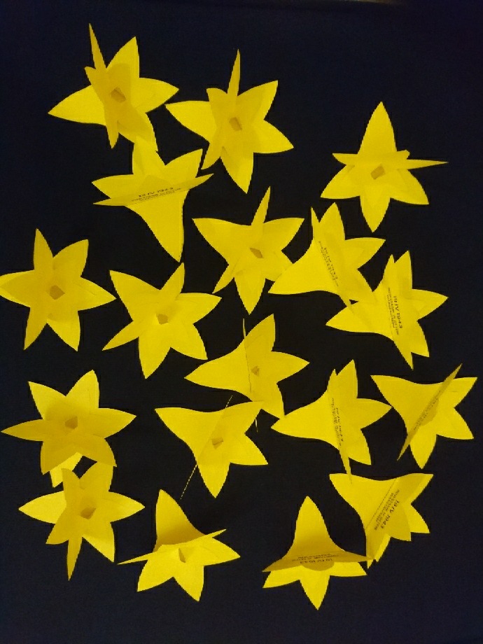 350 żółtych papierowych żonkili własnoręcznie przygotowały wolontariuszki z klas: 1c, 1d, 2d.