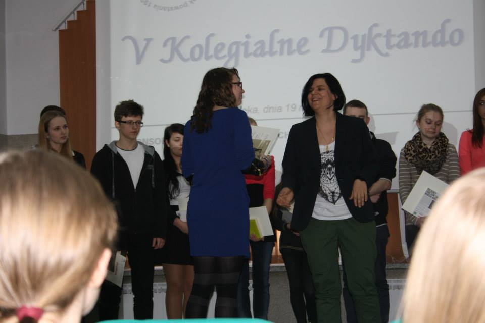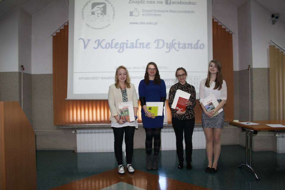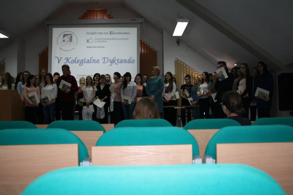 W związku z przypadającym 21 lutego Światowym Dniem Języka Ojczystego 19 marca 2015 r. w Zespole Kolegiów Nauczycielskich odbyło się V Dyktando Kolegialne. Z naszej szkoły wzięło udział pięć osób: Joanna Bauer z II G, Magdalena Kośnik z II H, Paulina Wojtyła z II B, Paulina Kaczorowska z I F i Maria Wrzosek z I F. Dyktando rozpoczęło się o godzinie 10.00. O tytuł Kolegialnego Mistrza Ortografii 2015 roku walczyli uczniowie ze szkół z Ostrołęki, Ostrowi Mazowieckiej, Wyszkowa, Łomży i Przasnysza. Główna organizatorką była Pani dr Dorota Czyż. Tym razem nie udało się naszym uczennicom zdobyć nagrody rzeczowej, jednak wszyscy uczestnicy otrzymali dyplomy i nagrody książkowe.