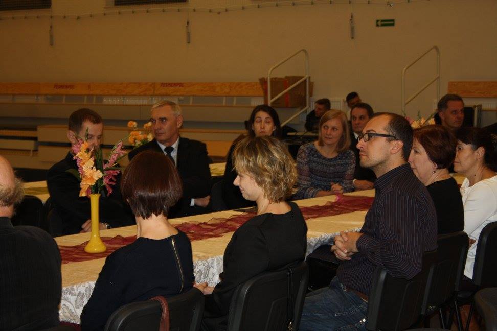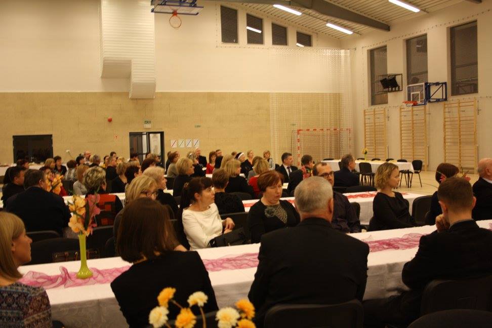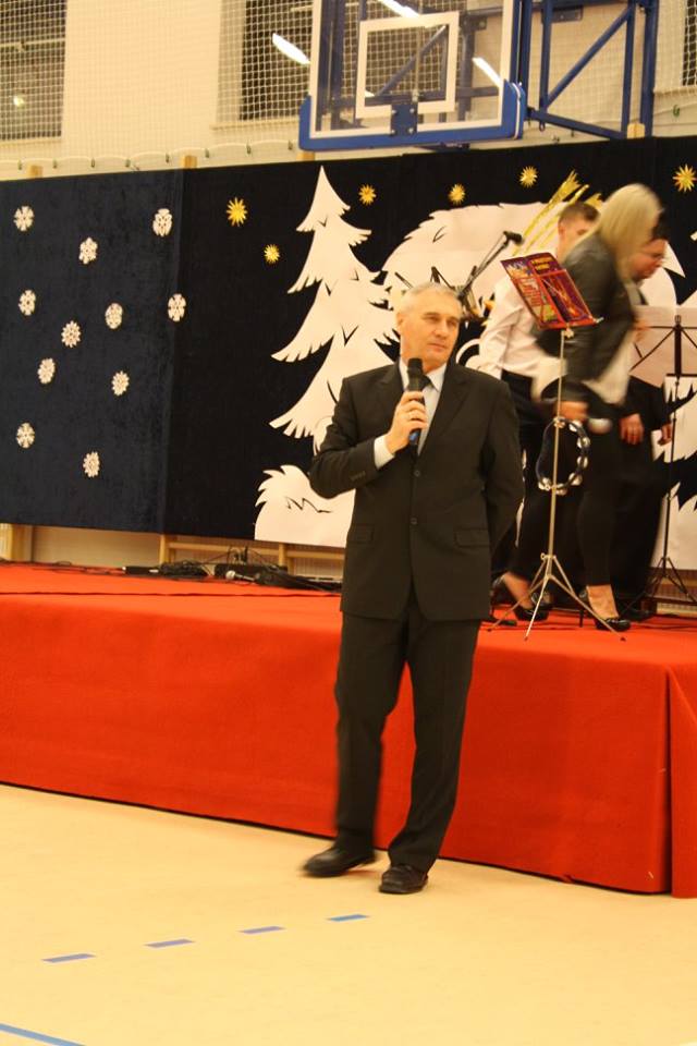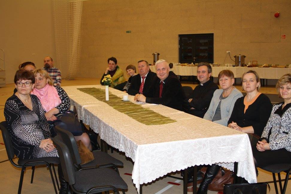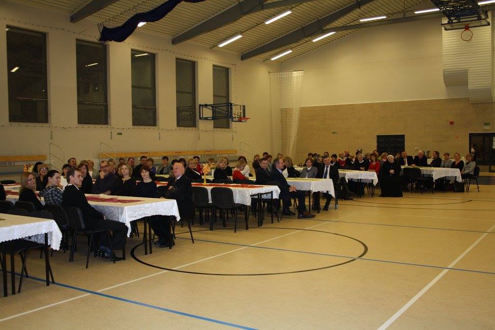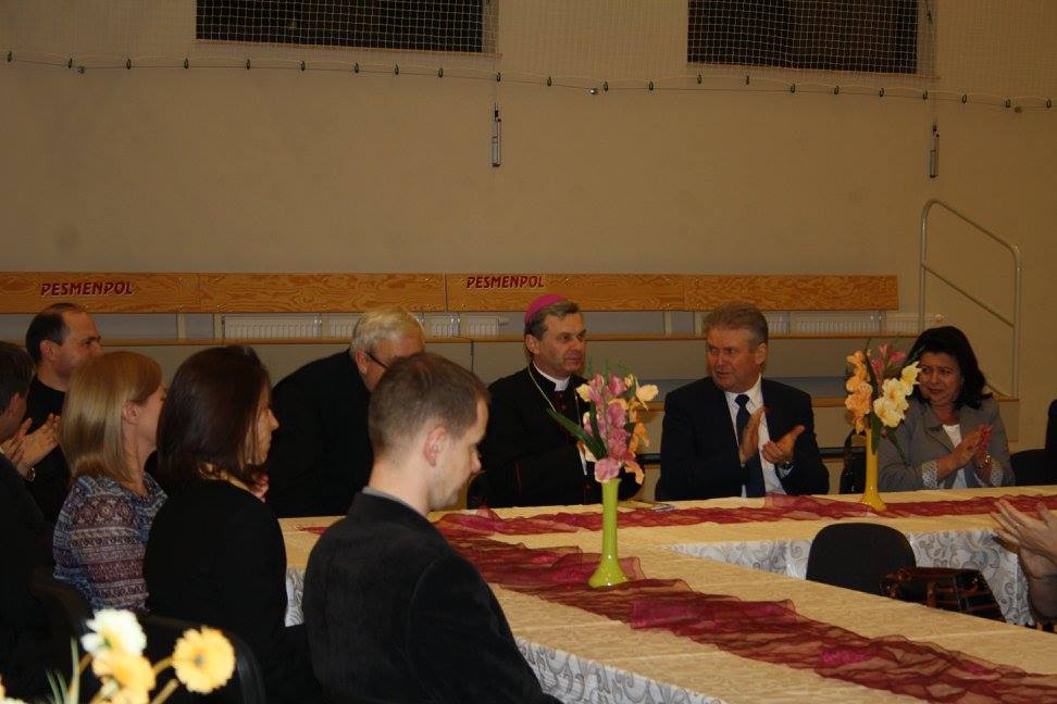 Po Mszy Świętej wszyscy ci, którzy chcieli uczestniczyć w spotkaniu zgromadzili się w hali naszej szkoły, gdzie oficjalnie Pan Dyrektor Waldemar Bartosik powitał gościa honorowego Biskupa Tadeusza Bronakowskiego.
