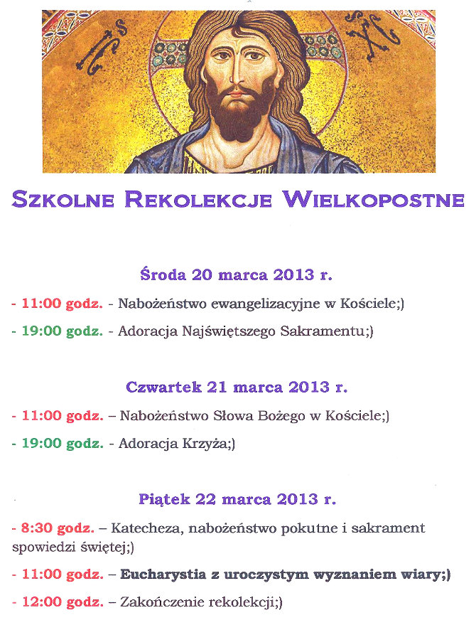 20 -22 marca 2013 – REKOLEKCJE WIELKOPOSTNE admin | 22 marca 2013 | 2012/13, Kronika | Brak komentarzy