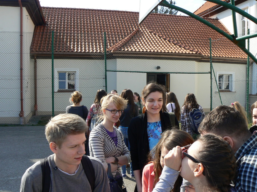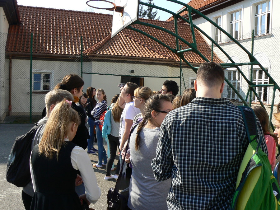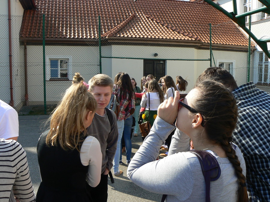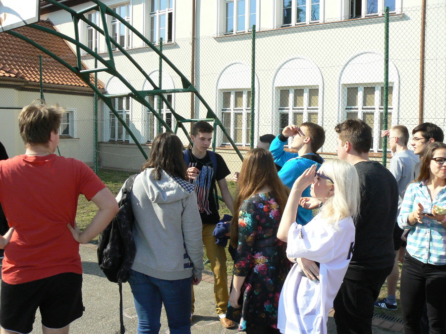 Z kolei zaćmienie Słońca ma miejsce wówczas, gdy Księżyc znajdzie się pomiędzy Ziemią a Słońcem i tym samym rzuci cień na naszą planetę. W Polsce 20 marca mogliśmy podziwiać to zjawisko w formie częściowej (przesłonięciu uległo – w zależności od regionu kraju – od ok. 65% do ok. 80% tarczy słonecznej). W obserwacji zaćmienia Słońca na boisku szkolnym uczestniczyła również młodzież naszej szkoły. Aby zabezpieczyć nasze oczy przed szkodliwym działaniem promieni UV, zjawisko zaćmienia oglądaliśmy przez specjalne szkło spawalnicze. Cały proces nasuwania się tarczy Księżyca na tarczę Słońca, trwał od około godziny 9.45 do około godziny 12.05, a moment kulminacyjny zjawiska nastąpił około godziny 10.55. Dało się wówczas zauważyć znacznie mniejsze oświetlenie naszego otoczenia. Krótka fotorelacja z obserwacji zaćmienia znajduje się poniżej.