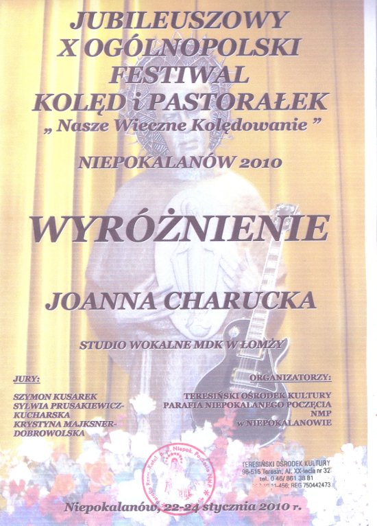 W dniach 22-24 stycznia br odbył się w Niepokalanowie X Ogólnopolski Festiwal Kolęd i Pastorałek „Nasze wieczne kolędowanie”. W konkursie wzięło udział 82 młodych wykonawców z całej Polski. Wśród nich znalazła się również uczennica klasy I G Joanna Charucka, która otrzymała wyróżnienie w kategorii 13-18 lat za wykonanie pastorałek „Nie śpij Jezu” i „Ucichłeś Jezuleńku”. Nagród głównych w tej kategorii nie przyznano.