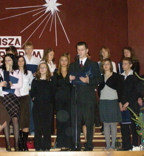 22 grudnia był w naszej szkole dniem choinki, świątecznego nastroju, składania życzeń i śpiewania kolęd. Po trzech lekcjach, które przepłynęły w raczej rozluźnionej atmosferze – zresztą powiedzmy sobie szczerze: kto w piątek przed Wigilia ma głowę do nauki? Tudzież do uczenia? – przyszedł czas na ogólnoszkolne spotkanie na sali gimnastycznej, gdzie zostały przedstawione jasełka opracowane pod kierunkiem pani Doroty Olender i pani Elżbiety Michalik, z udziałem chóru, który przygotował, którym dyrygował i w którym także śpiewał pan Artur Miernicki. Wszyscy występujący dali z siebie wszystko, ale nie można szczególnego uznania i podziwu odmówić naszemu szkolnemu chórowi, który na cztery głosy przepięknie śpiewał znane i nieznane kolędy. Uświetnił też wigilijne spotkanie nauczycieli. Nie obyło się bez życzeń pana Dyrektora, złożonych uroczyście całemu personelowi szkoły oraz uczniom. Oczywiście poszczególne klasy spotkały się na swoich wigiliach, żeby przełamać się opłatkiem i złożyć sobie życzenia. W ten sposób przeszliśmy z atmosfery wytężonej pracy umysłowej do łagodnego świątecznego zadumania.