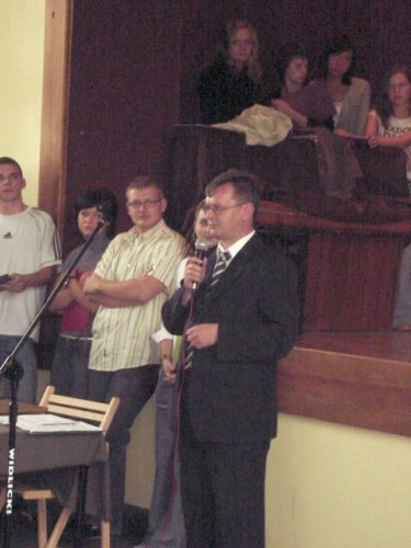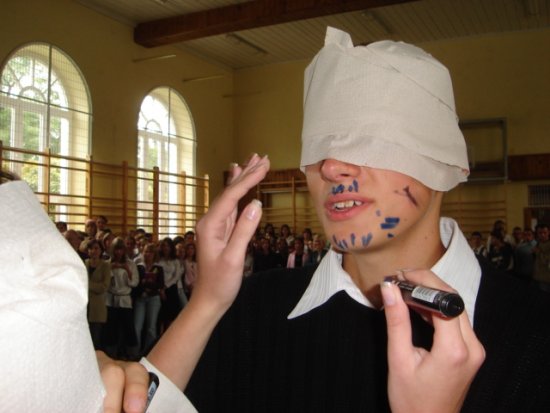 Tradycyjnie, jak to w naszym LO, całą imprezkę rozpoczął Pan Dyrektor swoim podniosłym przemówieniem, z którego, jak sądzę, Pierwszaki i tak niewiele zrozumiały. Kto byłby w stanie słuchać czegokolwiek tkwiąc w strachu przed uczestnictwem w tych nieprzewidywalnych, barbarzyńskich konkurencjach!? Na szczęście udało Im się przynajmniej wydukać drżącymi głosami treść oficjalnej przysięgi odczytanej przez prof. Nowickiego. Powitaniem naszych Nowych Nabytków zajął się również prof. Zawisza. Czyli, jak przystało na elitarną szkołę, zaoferowaliśmy Im czysto „lingwistyczny” wstęp do nowej drogi edukacji! 😉 Po tych wszystkich przemówieniach, wystąpieniach, ostrzeżeniach, zapewnieniach…przyszedł czas na RZEŹ NIEWINIĄTEK, umownie zwaną, „częścią artystyczną”.