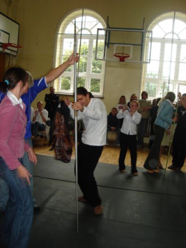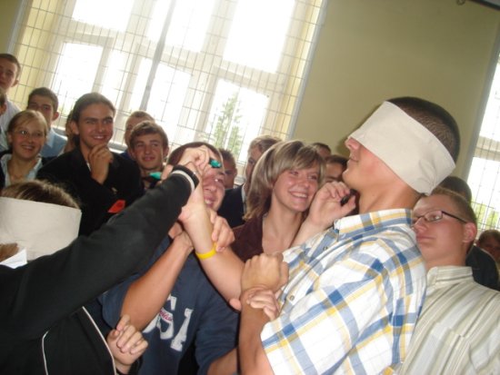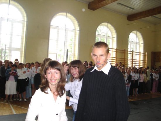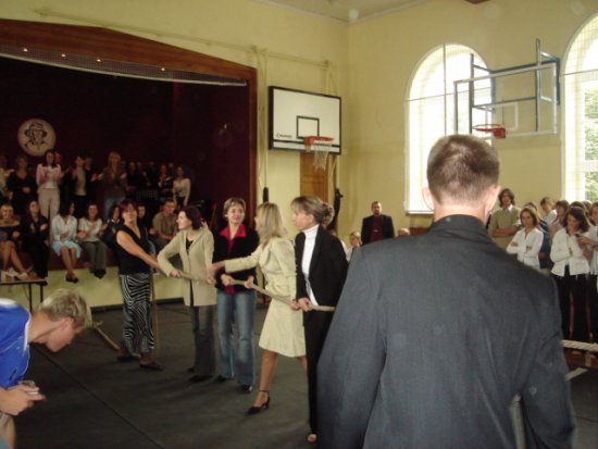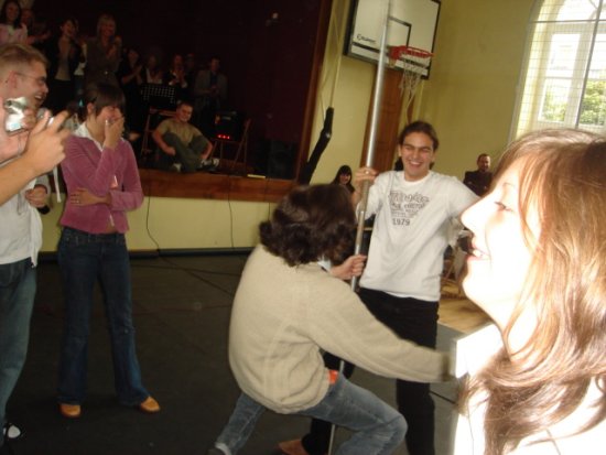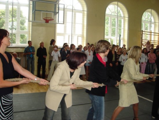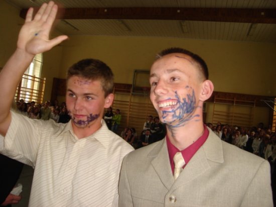 Skoro Rada Pedagogiczna mogła zmusić Pierwszaków do składania wielkich obietnic, to i Samorząd Uczniowski mógł! Koty Szarobure przyrzekały nie palić… ognisk za garażami i zawsze częstować starszych kolegów… kanapkami :p (by the way – coś się nam SU nie stara, bo ślubowanie jest co roku tej samej treści, ale rozumiem – TRADYCJA! :p ). I oczywiście główne danie imprezy – mleczko 😀 Po konsumpcji tego wyrafinowanego trunku przewodniczący klas zapewnili nas o jego niewątpliwej pyszności…:D Później, jak to na prawdziwych chrzcinach, trzeba było oblać wodą łebki Kotów. Przyznam że nie wiedziałam do tej pory, że aż tak wiele osób może się zmieścić pod ścianami naszej sali! Chociaż wcale się nie dziwię tym próbom ucieczki, bo Panowie Chrzciciele z klas trzecich machali szczotkami do czyszczenia toalet z wielkim rozmachem… Czyżby mania wyższości? :p I żeby nie było, że nie jesteśmy twórczą szkołą, konkurs plastyczny też był. Niektórym Kotom naprawdę dobrze w tych markerowych wąsach…:p Wielkie emocje na sali wzbudziła konkurencja taneczna…a konkretnie taniec przy… oszczepie :p Ciśnienie podskoczyło zapewne niejednej Kotce, kiedy do akcji wkroczył kolega z Ia – należą się brawa za prawdziwie KOCIE ruchy 😀 Spokojnie mógłby wystąpić w nowej edycji Tańca Z Gwiazdami, TRZYMA CHŁOPAK FASON!!! A w ramach deseru – konkurencja dla wychowawców skazanych na 3 ciężkie lata z rocznikiem ’89. Przeciąganie liny. Wygrały Panie, z (naprawdę niewielką) pomocą swoich wychowanków 😉