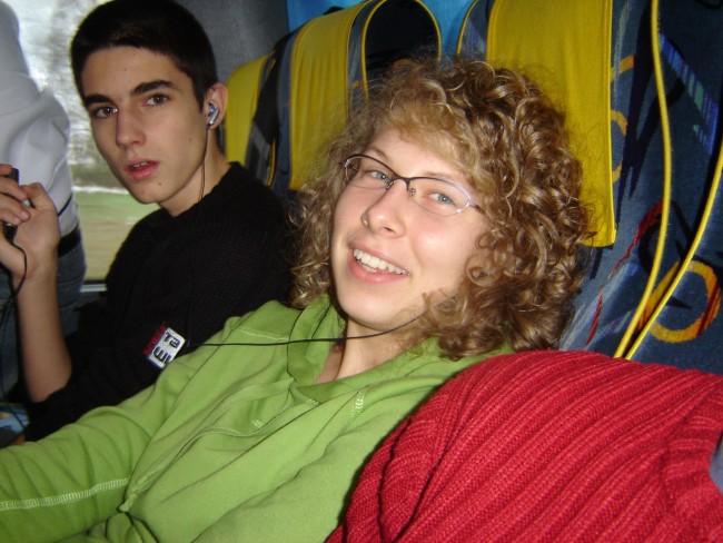 Gdzieś koło ósmej trzydzieści: Wyjechaliśmy. Wprawdzie okazało się, że filmu w autobusie nie obejrzymy, bo trzeba płacić, ale i tak jest super.