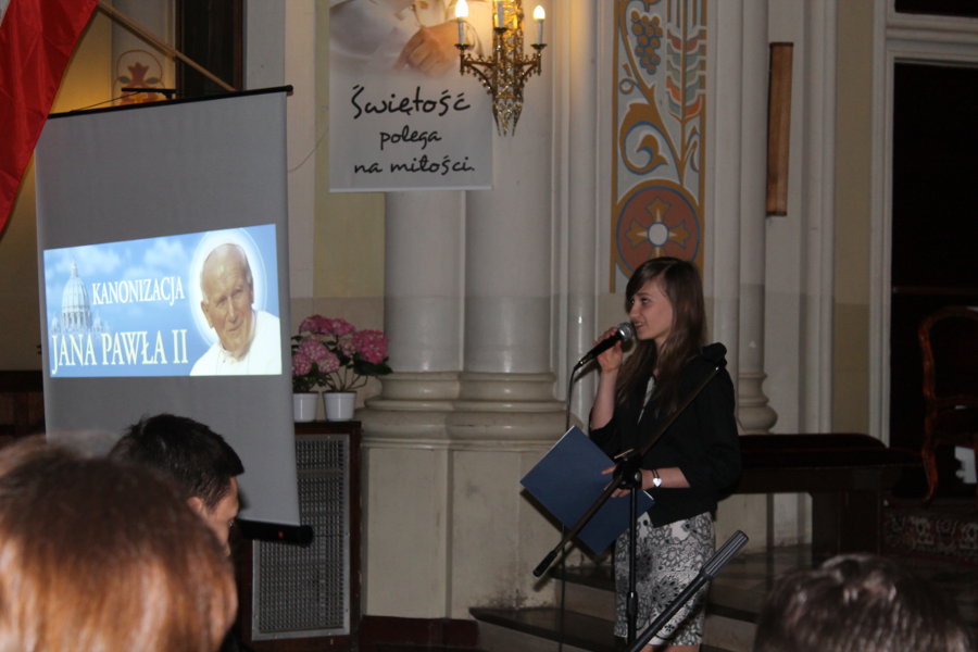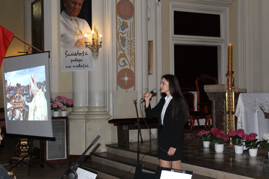 26 kwietnia 2014r. – koncert z okazji kanonizacji Jana Pawła II admin | 26 kwietnia 2014 | 2013/14, Kronika | Brak komentarzy Dnia 26 kwietnia 2014r. (sobota) o godz. 9.00 uczniowie naszej szkoły przedstawili krótki montaż słowno – muzyczny z okazji kanonizacji Jana Pawła II i Jana XXIII. W drugiej części występu odbył się koncert poetycko – wokalny. Foto: Magdalena Reluga