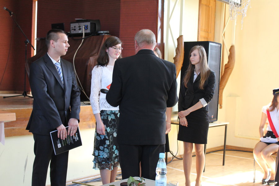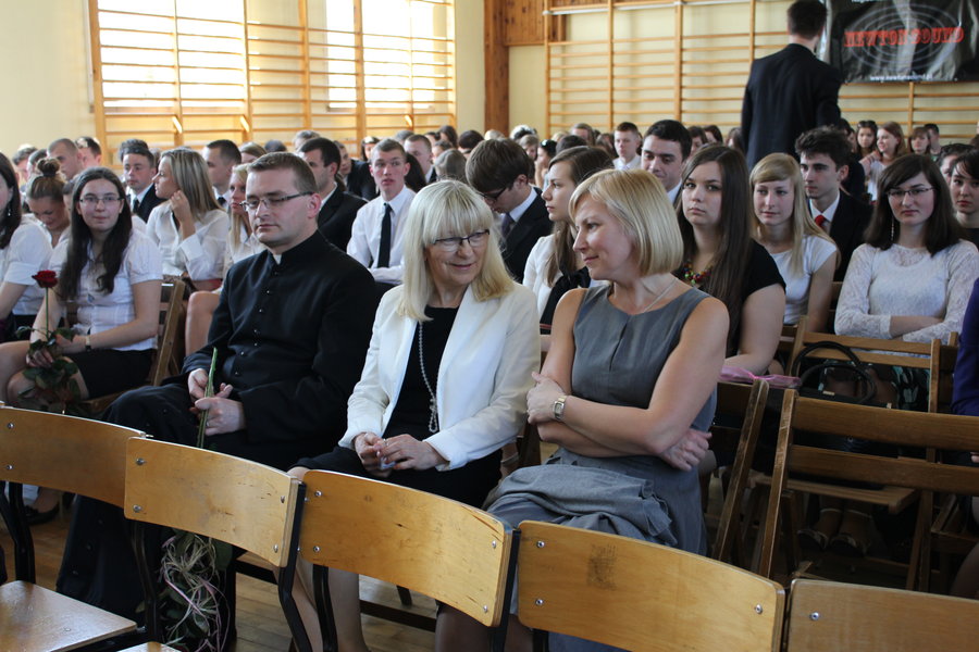 W dniu 27 kwietnia pożegnaliśmy naszych maturzystów. Był to ich ostatni dzień w szkole, została już tylko matura – ten najważniejszy egzamin w ich życiu, od którego zależeć będą dalsze losy naszych absolwentów. Uroczystość w sali gimnastycznej rozpoczęła się o godzinie 12.30. Wśród gości zaproszonych byli: p. v-ce burmistrz Danuta Janusz, p. v-ce starosta Jerzy Bauer, p. przewodnicząca Koła Wychowanków Barbara Jaroszkiewicz, p. prezes Banku Spółdzielczego Bartosz Kublik, były dyrektor szkoły p. Tadeusz Zaniewski oraz przedstawiciele Rady Rodziców – p. Bogumiła Wujek, p. Magdalena Skalik, p. Mieczysław Rejniak, p. Mieczysław Orych oraz instruktor tańca p. Kazimierz Trzaska.