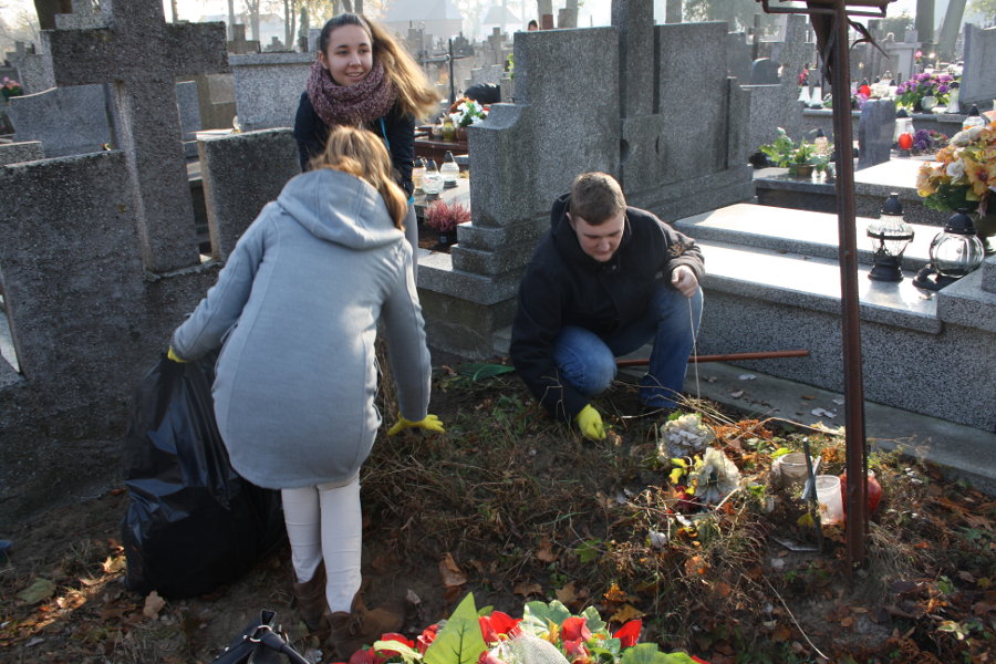 W tym dniu włączyliśmy się także w akcję sprzątania opuszczonych grobów, zorganizowaną przez Młodzieżową Radę Powiatu. Z każdej ze szkół średnich, z LO im. M. Kopernika, z ZSZ nr 1 im. Witolda Pileckiego, z ZS nr 2 im. Powstańców Styczniowych oraz ZS w Lubiejewie przybyli uczniowie i ruszyli do pracy, wyposażeni w grabie, worki, rękawiczki sprzątali groby, których od dawna nikt nie odwiedzał. Dzięki tej akcji cmentarz zyskał lepszy wizerunek, a młodzieży należy tylko podziękować, że są chętni do tak bezinteresownych działań.