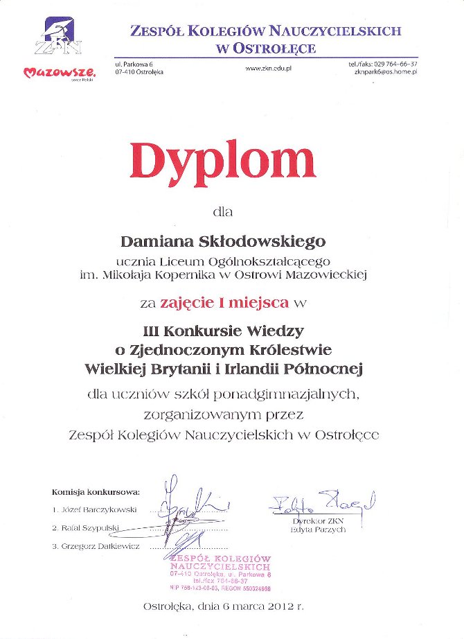 6 marca 2012r. – konkurs języka angielskiego admin | 6 marca 2012 | 2011/12, Kronika | Brak komentarzy Damian Skłodowski zajął I miejsce w Konkursie Wiedzy o Zjednoczonym Królestwie Wielkiej Brytanii i Irlandii Północnej. Konkurs odbył się 6 marca w Zespole Kolegiół Nauczycielskich w Ostrołęce. Foto: www.zkn.edu.pl
