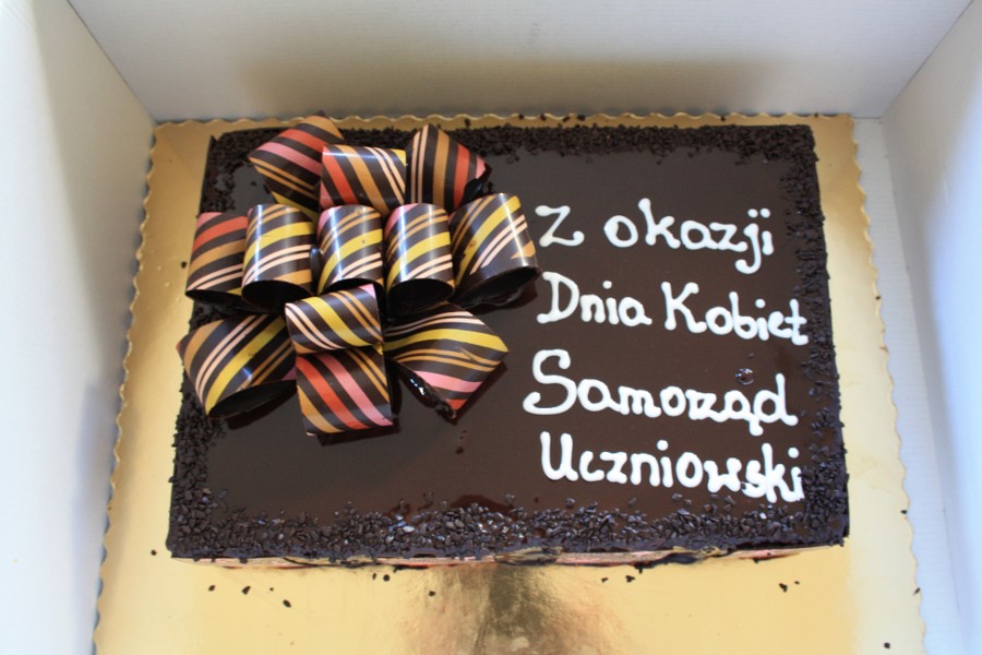 Podczas długiej przerwy na wszystkie panie z grona pedagogicznego oraz obsługi i administracji czekały pyszne torty. Tort od Samorządu Uczniowskiego dostarczył Mateusz Rosiński, który życzył Paniom wszystkiego tego co najlepsze.