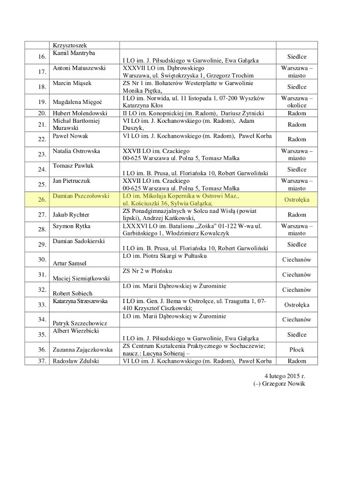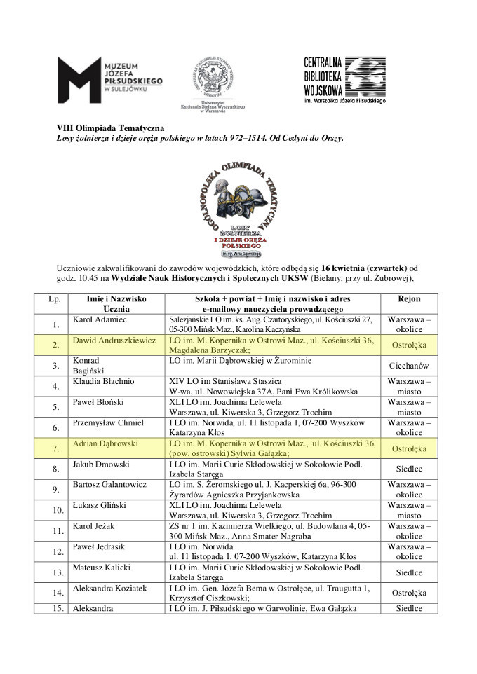 W grudniu odbyła się w Ostrołęce VIII Olimpiada Tematyczna „Losy żołnierza i dzieje oręża polskiego w latach 972-1514. Od Cedyni do Orszy.” Udział wzięło trzech naszych uczniów: Dawid Andruszkiewicz z II E, Adrian Dąbrowski i Damian Pszczółowski z III E, którzy zostali zakwalifikowani do zawodów wojewódzkich, które odbędą się w kwietniu na Wydziale Nauk Historycznych i Społecznych UKSW. Serdecznie gratulujemy zwycięzcom i życzymy kolejnych sukcesów.