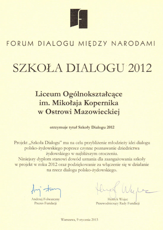 9 stycznia 2013 r. grupa dziesięciu uczniów reprezentujących klasę III h wzięła udział w uroczystym podsumowaniu działań, które złożyły się na ubiegłoroczną edycję projektu „Szkoła Dialogu”.