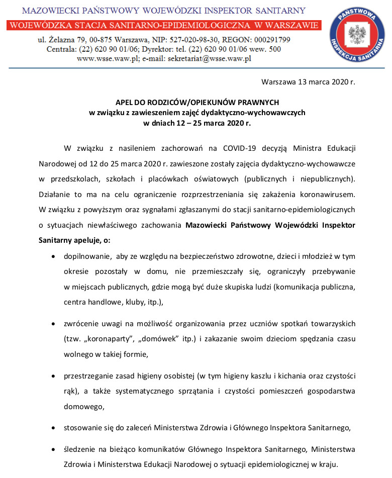 Apel MPWIS do rodziców admin | 16 marca 2020 | 2019/20, Kronika | Brak komentarzy APEL DO RODZICÓW/OPIEKUNÓW PRAWNYCH w związku z zawieszeniem zajęć dydaktyczno-wychowawczych w dniach 12 – 25 marca 2020 r.