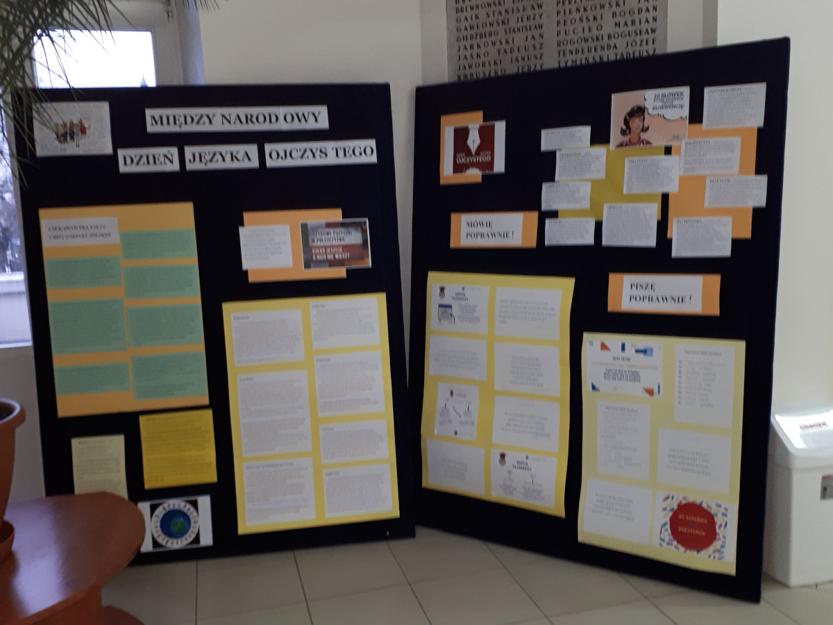 Na korytarzu pierwszego piętra została przygotowana przez bibliotekarzy i polonistów „wystawa” przedstawiająca ciekawostki dotyczące języka polskiego, informacje dotyczące zapożyczeń oraz wskazówki jak uniknąć najpowszechniejszych błędów językowych, ortograficznych. Na drzwiach pracowni w całej szkole pojawiły się „tabliczki” zawierające informacje o różnych zjawiskach językowych, zagadnieniach poprawności językowej oraz wierszyki „dla języka gimnastyki”.