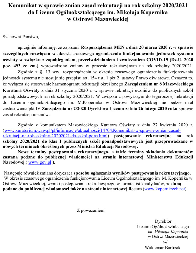 Komunikat Dyrektora Liceum w sprawie zmian zasad rekrutacji admin | 30 kwietnia 2020 | 2019/20, Kronika, Rekrutacja | Brak komentarzy Pobierz dokument w formacie pdf.