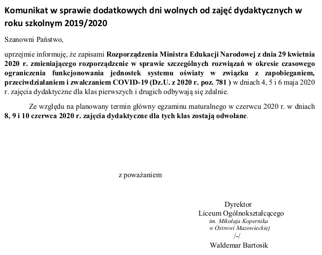 Komunikat w sprawie dni wolnych od zajęć edukacyjnych. admin | 30 kwietnia 2020 | 2019/20, Kronika, Ogłoszenia | Brak komentarzy