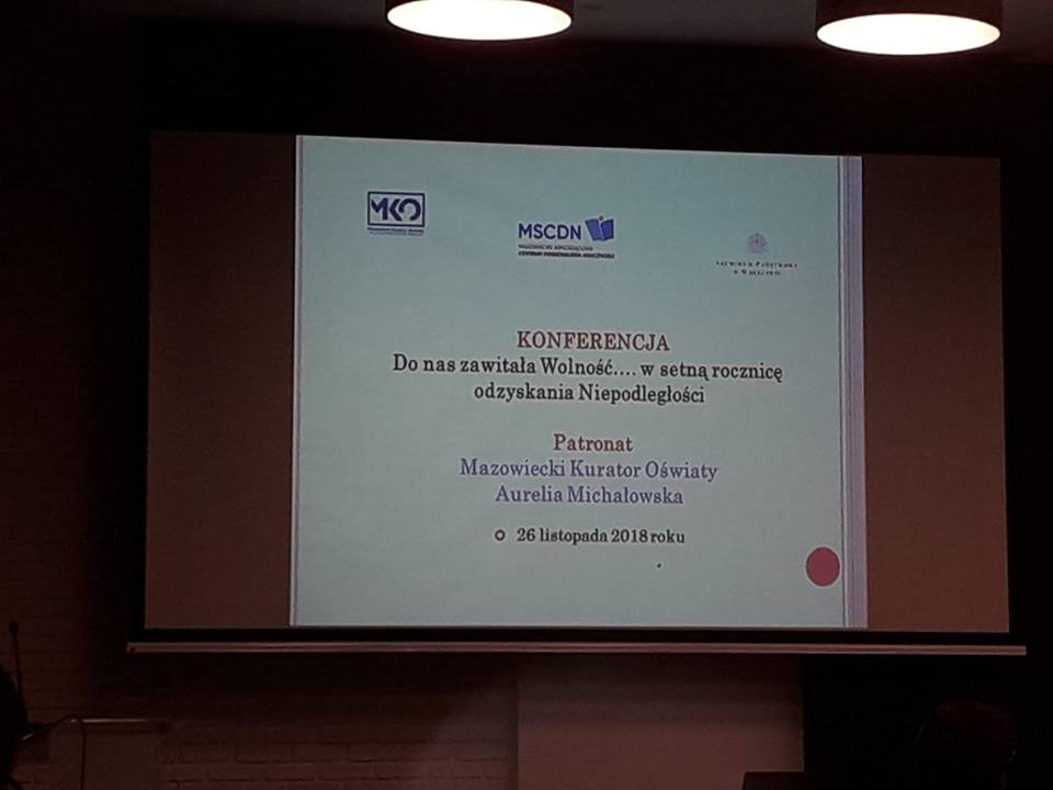 W poniedziałek 26 listopada 2018 roku w Warszawie, odbyła się konferencja „Do nas zawitała Wolność…” z okazji setnej rocznicy odzyskania Niepodległości. Konferencję zorganizowało Mazowieckie Samorządowe Centrum Doskonalenia Nauczycieli oraz Archiwum Państwowe.Udział wzięli nauczyciele historii: p. Sylwia Gałązka, p. Monika Kuziak, p. Magdalena Barzyczak, p. Marcin Kulesza wraz z delegacją Uczniów, z klas I i II. Prelegentami konferencji był, m.in. prof. dr hab. Grzegorz Nowik, Kierownik Działu Historii i Badań Naukowych Muzeum Józefa Piłsudskiego w Sulejówku, konsultant historyczny nowego filmu „Niepodległość”.
