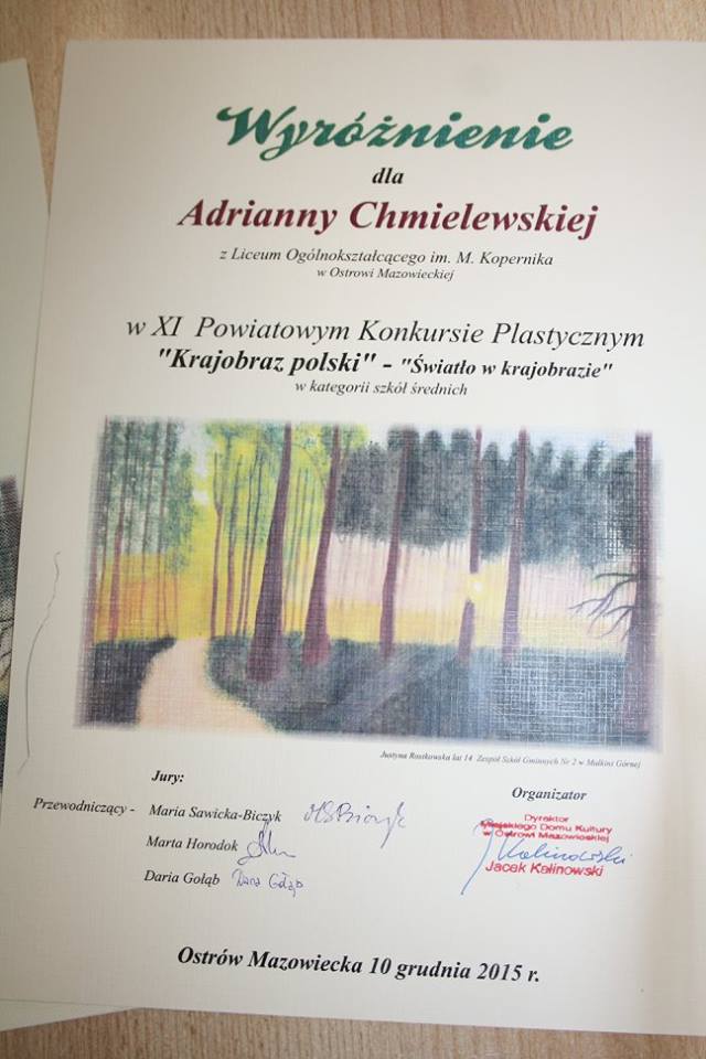 Spośród szkół ponadgimnazjalnych w konkursie udział wzięła tylko nasza szkoła, a wyróżnienie otrzymała Adrianna Chmielewska z kl. II G. Gratulacje!