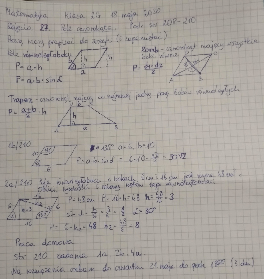 Zajęcia 27. 18 maja 2020. Pole czworokąta. Podręcznik str 208-211. Przesyłam materiały, kilka rozwiązanych zadań i zadania do samodzielnego rozwiązania. Zdjęcia rozwiązań proszę przesłać przez Messenger lub e-mail k.studnicki@koperniczek.net Na rozwiązania czekam 3 dni do czwartku do godz. 18.00.