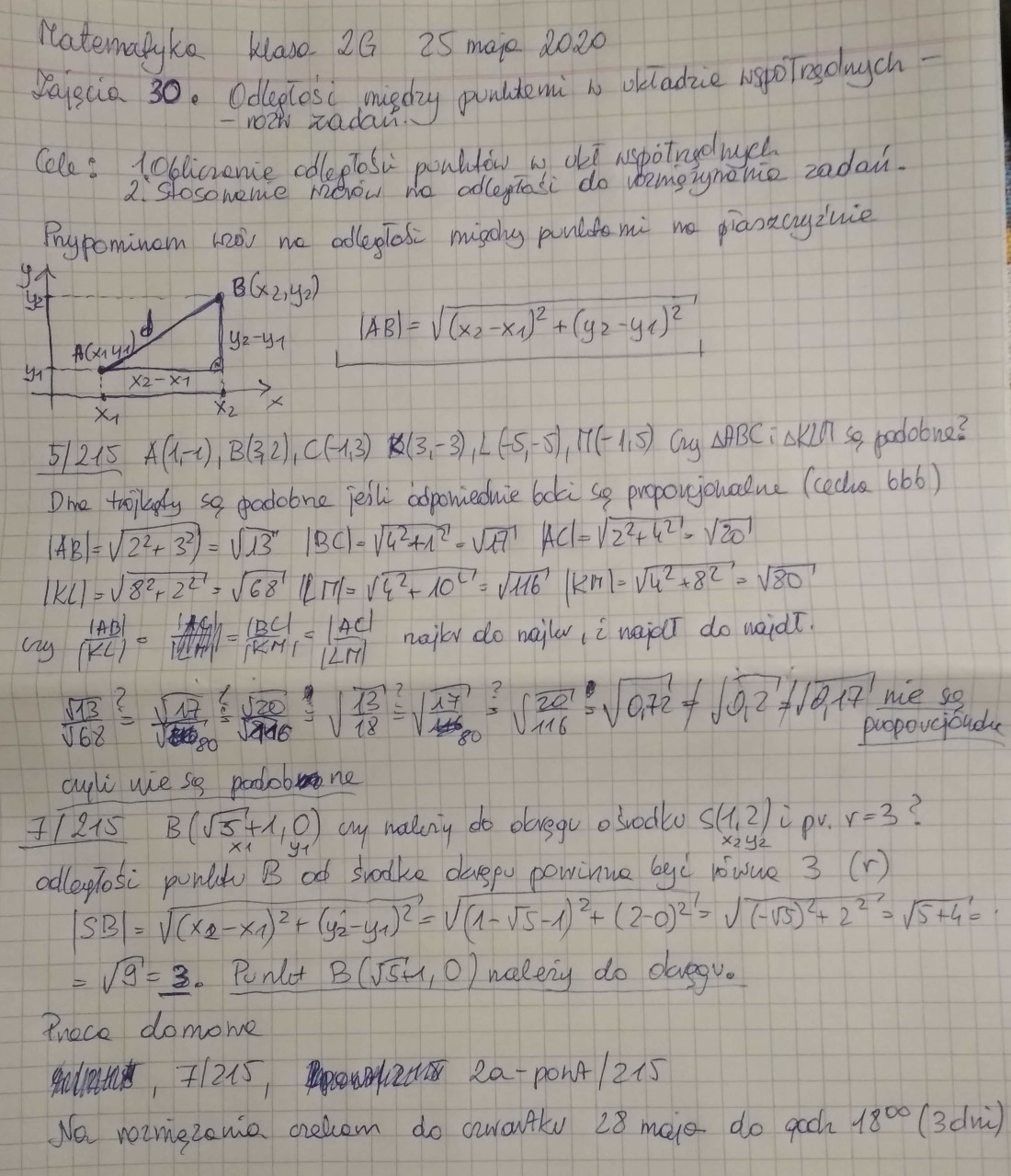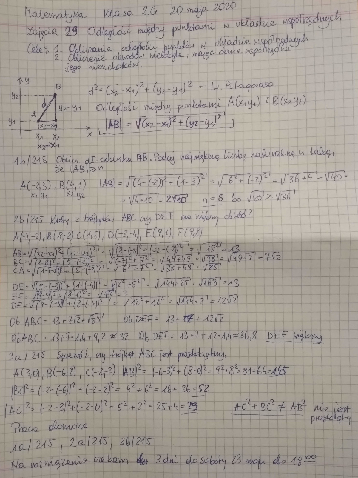 Zajęcia 29. 20 maja 2020. Odległość między punktami w układzie współrzędnych. Podręcznik str 213-215. Przesyłam materiały, kilka rozwiązanych zadań i zadania do samodzielnego rozwiązania. Zdjęcia rozwiązań proszę przesłać przez Messenger lub e-mail k.studnicki@koperniczek.net Na rozwiązania czekam 3 dni do soboty do godz. 18.00.