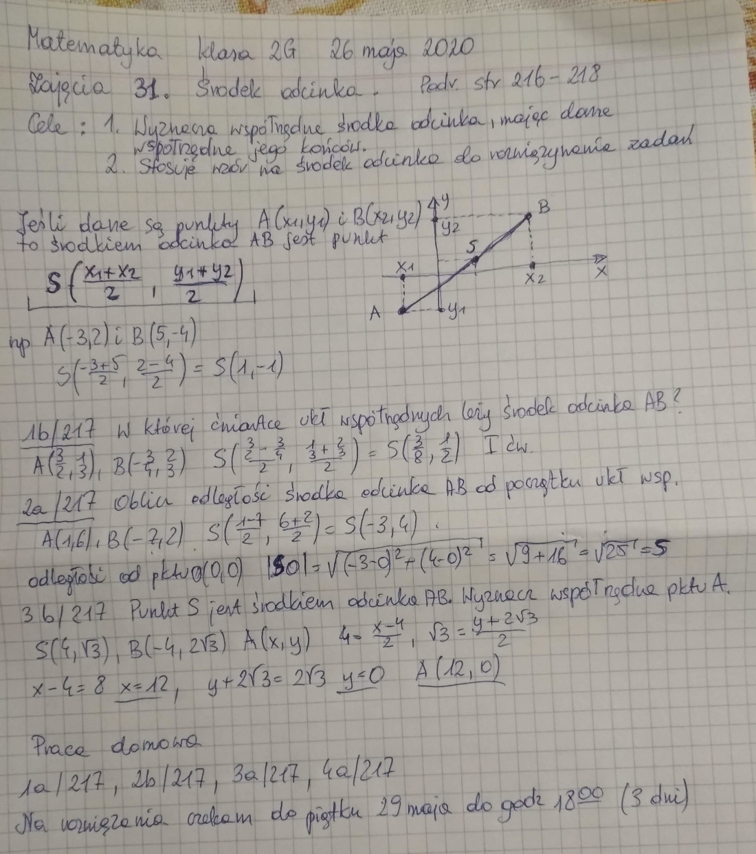 Zajęcia 31. 26 maja 2020. Środek odcinka. Podręcznik str 216-218. Przesyłam materiały, kilka rozwiązanych zadań i zadania do samodzielnego rozwiązania. Zdjęcia rozwiązań proszę przesłać przez Messenger lub e-mail k.studnicki@koperniczek.net Na rozwiązania czekam 3 dni do piątku do godz. 18.00.
