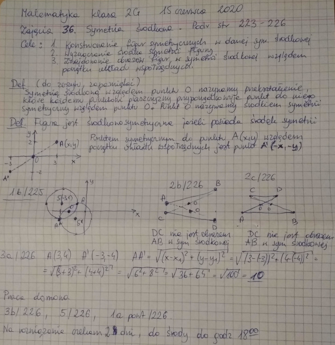 Zajęcia 36. 15 czerwca 2020. Symetria środkowa. Podręcznik str 223-226. Przesyłam materiały, kilka rozwiązanych zadań i zadania do samodzielnego rozwiązania. Zdjęcia rozwiązań proszę przesłać przez Messenger lub e-mail k.studnicki@koperniczek.net Na rozwiązania czekam 2 dni do środy do godz. 18.00.