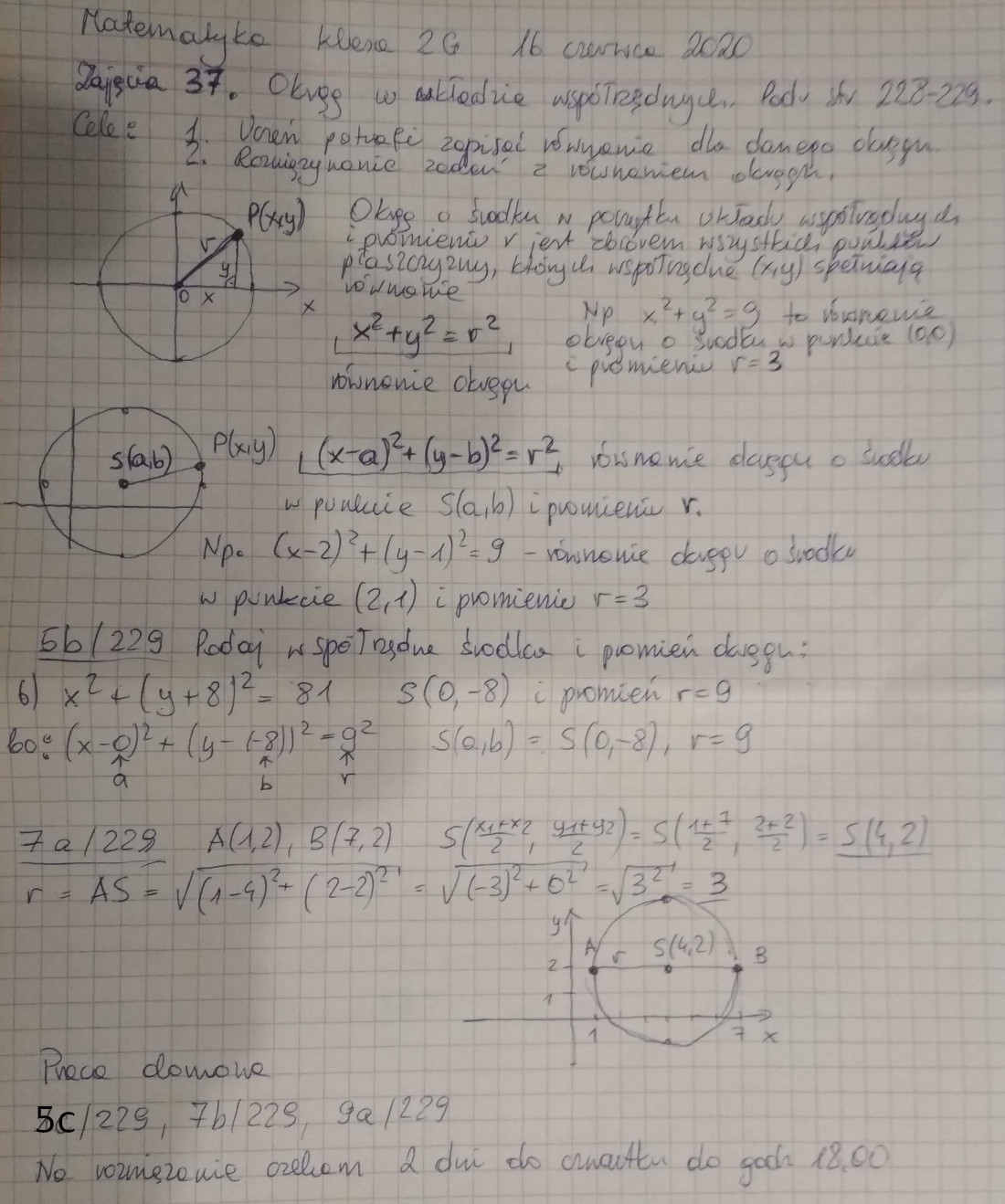 Zajęcia 37. 16 czerwca 2020. Okrąg w układzie współrzędnych. Podręcznik str 228-229. Przesyłam materiały, kilka rozwiązanych zadań i zadania do samodzielnego rozwiązania. Zdjęcia rozwiązań proszę przesłać przez Messenger lub e-mail k.studnicki@koperniczek.net Na rozwiązania czekam 2 dni do czwartku do godz. 18.00.
