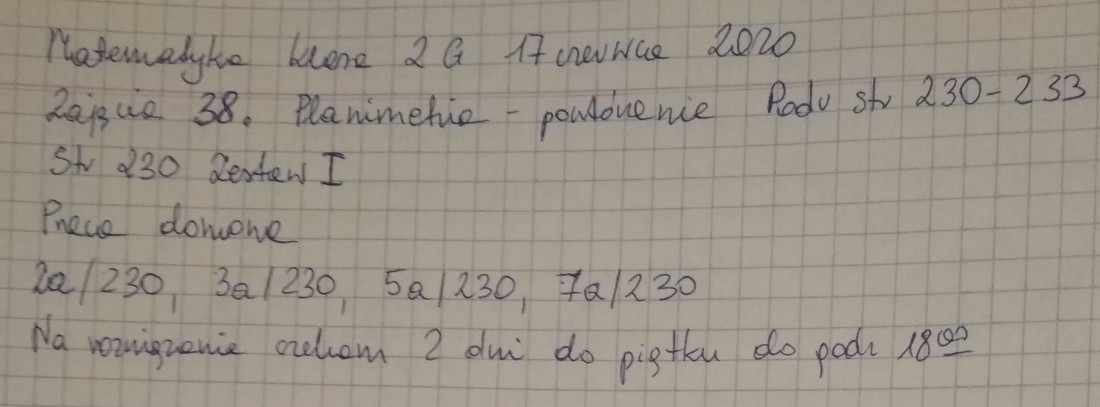 Zajęcia 38. 17 czerwca 2020. Planimetria – powtórzenie. Podręcznik str 230-233. Przesyłam materiały. Zdjęcia rozwiązań proszę przesłać przez Messenger lub e-mail k.studnicki@koperniczek.net Na rozwiązania czekam 2 dni do piątku do godz. 18.00.