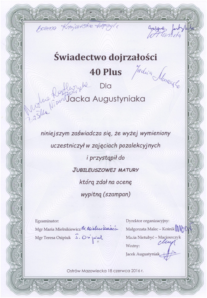 18 czerwca 2016 r. odbyło się takie spotkanie – nowe i stare. Z okazji czterdziestej rocznicy matury rocznik 1976 naszego Liceum spotkał się na zajęciach poza lekcyjnych pod hasłem „ 40 plus” (tylko bez podtekstów politycznych proszę: w maju minęło 40 lat od matury, a spotkanie odbyło się w czerwcu, czyli plus jeden miesiąc).