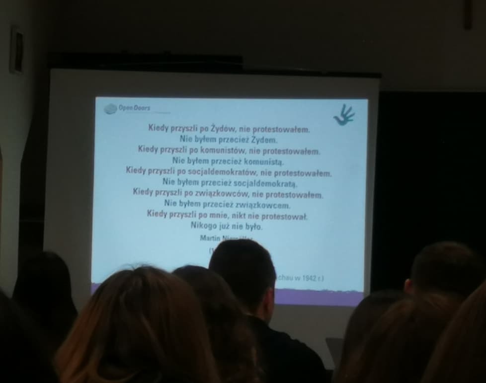 10 grudnia 2019 r. w ramach obchodów Międzynarodowego Dnia Praw Człowieka, uczniowie klas 2h, 2d, 3g, 3h uczestniczyli w spotkaniu z przedstawicielem Międzynarodowej Organizacji Open Doors Polska. Prelegent organizacji opowiedział o relacjach między muzułmanami i chrześcijanami i sytuacjach w jakich łamane są prawa człowieka w Egipcie, Syrii i Iraku. Młodzież naszej szkoły pod kierunkiem pana Marcina Kuleszy przygotowała w tym dniu prezentację dotyczącą łamania praw człowieka, która wyświetlana była na dolnym korytarzu szkolnym.