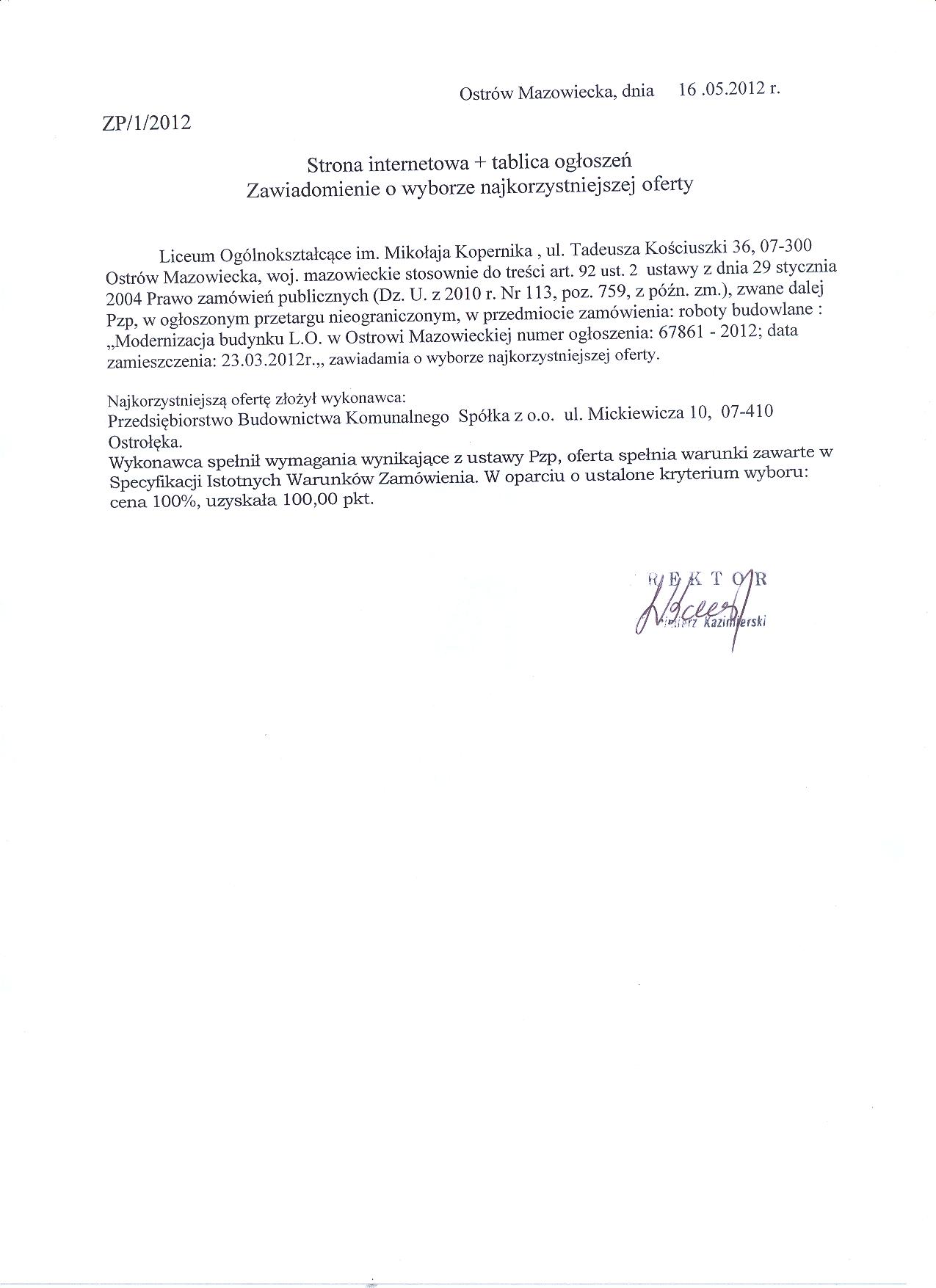 Zawiadomienie o wyborze najkorzystniejszej oferty.