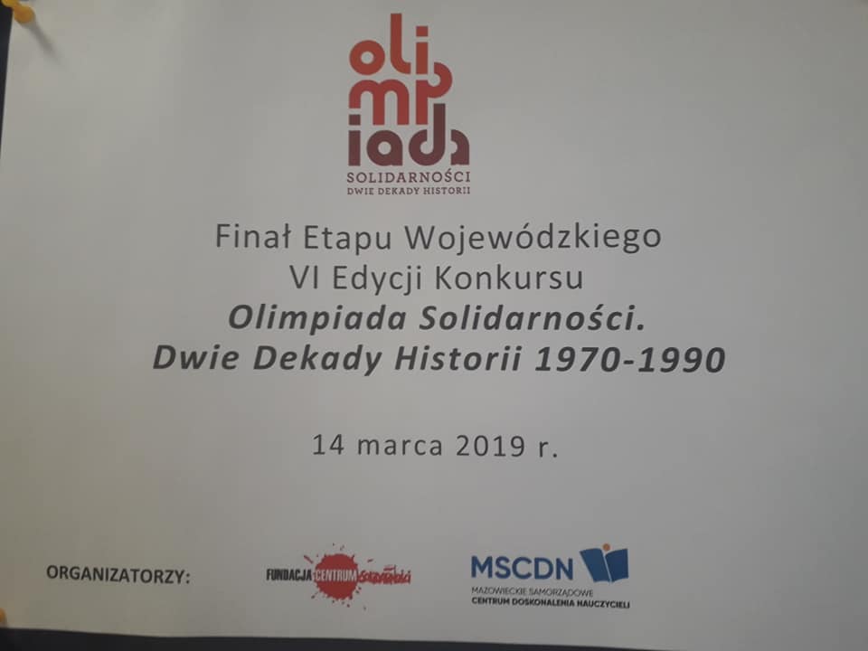 14 marca, we wszystkich miastach wojewódzkich w Polsce, odbył się drugi etap VI edycji „Olimpiady Solidarności”. Do rywalizacji przystąpiło 840 uczestników wyłonionych z ponad 3500 uczniów, którzy zgłosili się do etapu szkolnego konkursu. Egzamin polegał na rozwiązaniu testu z wiedzy historycznej, obejmującej lata 1970-1990. Naszą szkołę reprezentował Adam Stefaniak z kl. II f.