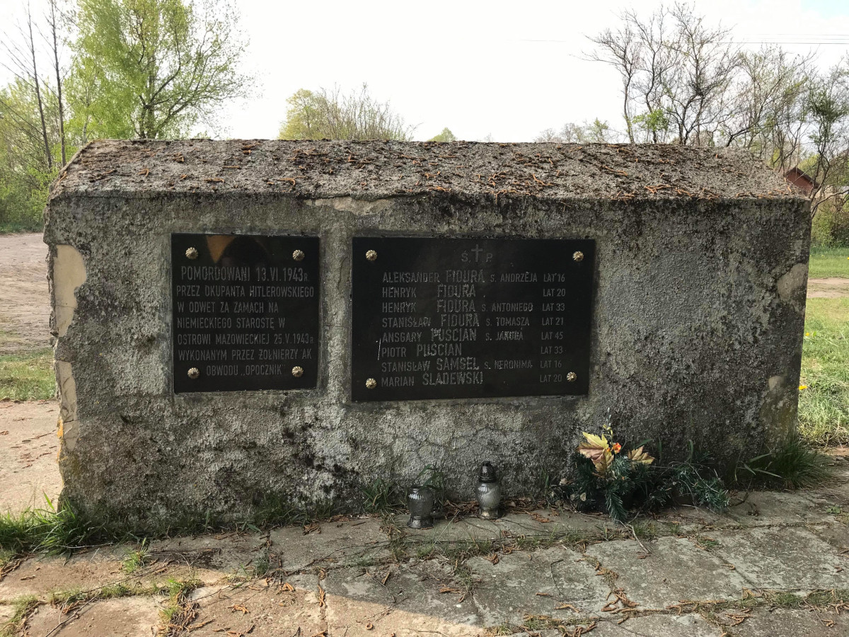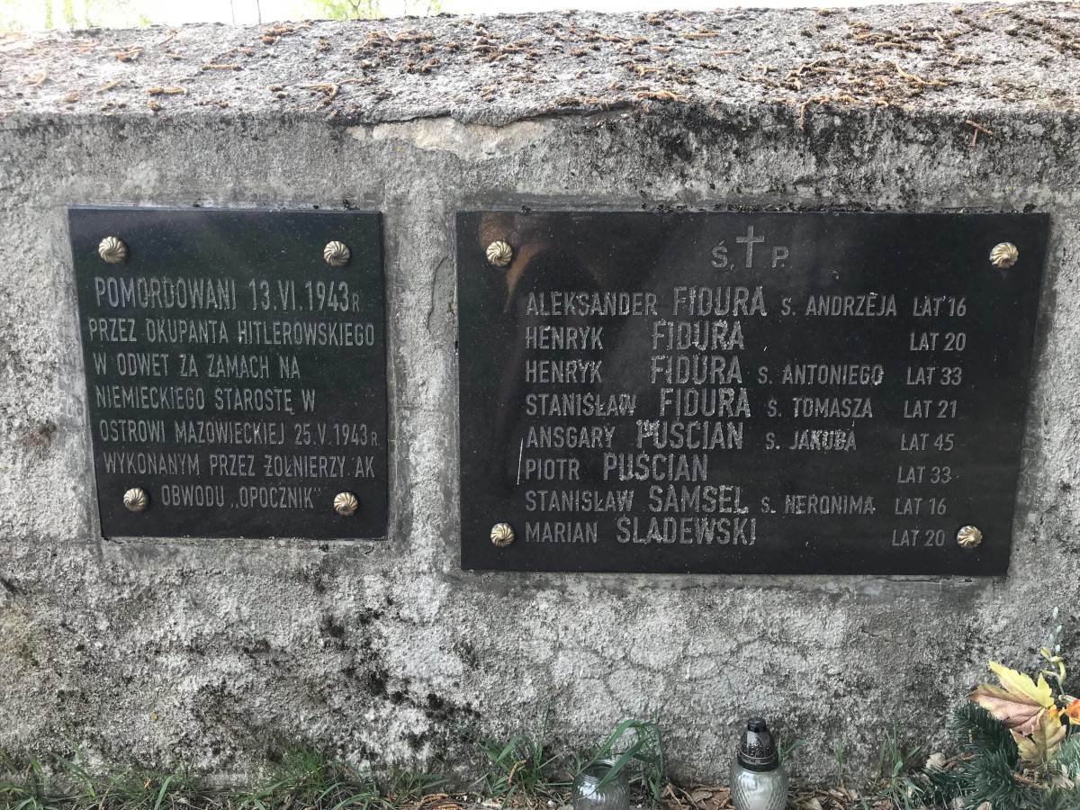 Fidury to niewielka wieś oddalona o około 90 km od Warszawy i należąca do gminy Ostrów Mazowiecka. 13 czerwca 1943 roku właśnie w tym miejscu dokonano egzekucji ośmiu młodych mężczyzn, wśród których znalazł się Marian Śladewski – brat mojego dziadka. Dużo o historii tego miejsca dowiedziałam się od mojej babci – Ireny, dla której mówienie o czasach II wojny światowej nie jest rzeczą łatwą. Lecz to właśnie dzięki świadkom tamtych wydarzeń jeszcze o nich nie zapominamy. Mój dziadek wywodził się z wielodzietnej rodziny, jeden z jego braci – Marian zginął tragicznie za ojczyznę. We wspomnieniach babci zapisał się on jako przystojny, okrągły na buzi, wysoki chłopiec. Ponadto był człowiekiem pracowitym, życzliwym, a w wolnych chwilach grał na harmonii. Był on ogromnym patriotą, miał w sobie chęć walki z okupantem. To spowodowało, że podjął się działalności partyzanckiej za co przepłacił życiem on i jego koledzy. Dzień Zielonych Świątek 1943 roku to dzień szczególnie zapamiętany przez moją prababcię – Aleksandrę Śladewską i pradziadka – Hieronima Śladewskiego, a także całą rodzinę Śladewskich. Tego dnia do jej syna – Mariana przyszli żołnierze III Rzeszy. Zastali go siedzącego na ganku domu swojej ciotki, u której mieszkał. Nic nie mówiąc wręczyli mu do ręki amunicję i kazali po prostu iść. W tym czasie strzelili w tył jego głowy. Kiedy tylko dowiedziała się o tym moja prababcia to szybko udała się do sąsiedniej wsi. Zobaczyła tam swojego syna, który leżał martwy. Pierwsze co zrobiła to podbiegła do niego i przytulając go zaczęła zbierać jego mózg. Nie wyobrażam sobie jak musi czuć się matka, której dziecko umiera i to jeszcze w tak okrutny sposób. Wiem tylko, że moja prababcia przez długi czas nie mogła dojść do siebie. Ta tragedia do końca życia pozostała w pamięci moich pradziadków i całej najbliższej rodziny. Oprócz Mariana Śladewskiego na Fidurach zginęli też inni, którzy działali w partyzantce. Śmierć ich była odwetem za zabójstwo niemieckiego starosty. Moja babcia powiedziała, że byli to: 21-letni Stanisław Fidura, 45-letni Ansgary Puścian, 33-letni Piotr Puścian, 20-letni Henryk Fidura, 33-letni Henryk Fidura oraz 16-letni: Stanisław Samsel i Aleksander Fidura. Babcia słyszała, że zginęli poprzez bicie bagnetami, rozstrzelanie, czy palenie żywcem. Prawdopodobnie przed śmiercią byli torturowani. Podpalano ich, a także podcinano im języki. Na Fidurach znajduje się obecnie niewielki pomnik, upamiętniający te wszystkie osoby, które oddały swoje życie za ojczyznę. Jednak mało osób, nawet mieszkańców gminy Ostrów Mazowiecka, słyszało o tym miejscu. Myślę, że warto powiedzieć o tamtych wydarzeniach, aby zwiększyć świadomość ludzi na temat lokalnej historii. Aleksandra Śladewska we współpracy z Ireną Śladewską