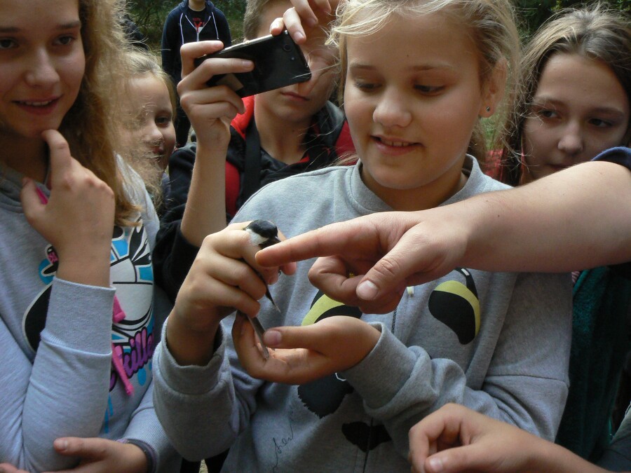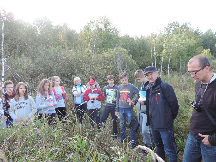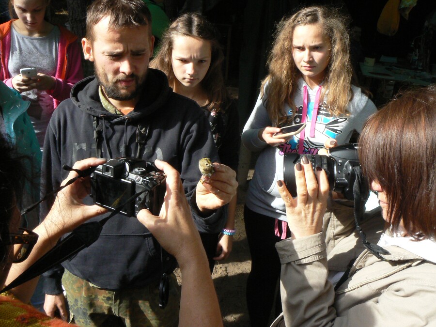 Następnie wycieczka udała się pod białoruską granicę, do rozbitego nad Zbiornikiem Siemianówka obozu obrączkowania ptaków. Polowy Obóz Ornitologiczny Akcja Siemianówka w tym roku (już po raz czternasty) rozpoczął swą działalność 10 lipca. Do dnia naszego przyjazdu naukowcy-wolontariusze, schwytali i zaobrączkowali ponad pięć tysięcy ptaków. Pełniący podczas naszej wizyty funkcję kierownika obozu p. Tomasz Tumiel, przekazał młodzieży podstawowe informacje o migracjach ptaków, gatunkach migrujących, technikach chwytania ptaków i celach ich obrączkowania. Uczniowie obejrzeli różne rodzaje obrączek przeznaczonych dla dużych i małych osobników. Zostali też poinstruowani, że w razie znalezienia zaobrączkowanego ptaka należy przekazać numer obrączki oraz dane na temat daty, miejsca znalezienia i stanu ptaka do Stacji Ornitologicznej Muzeum i Instytutu Zoologii PAN z Gdańska, która pełni funkcję krajowej centrali obrączkowania ptaków.