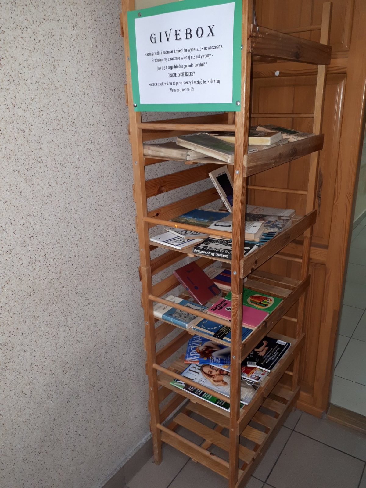 Od wczoraj, w bliskim sąsiedztwie biblioteki, znajduje się uroczy regalik (zamiast stoliczka z książkami), którego półki czekają na wypełnienie rzeczami, których nie potrzebujemy ale które mogą być użyteczne dla innych.