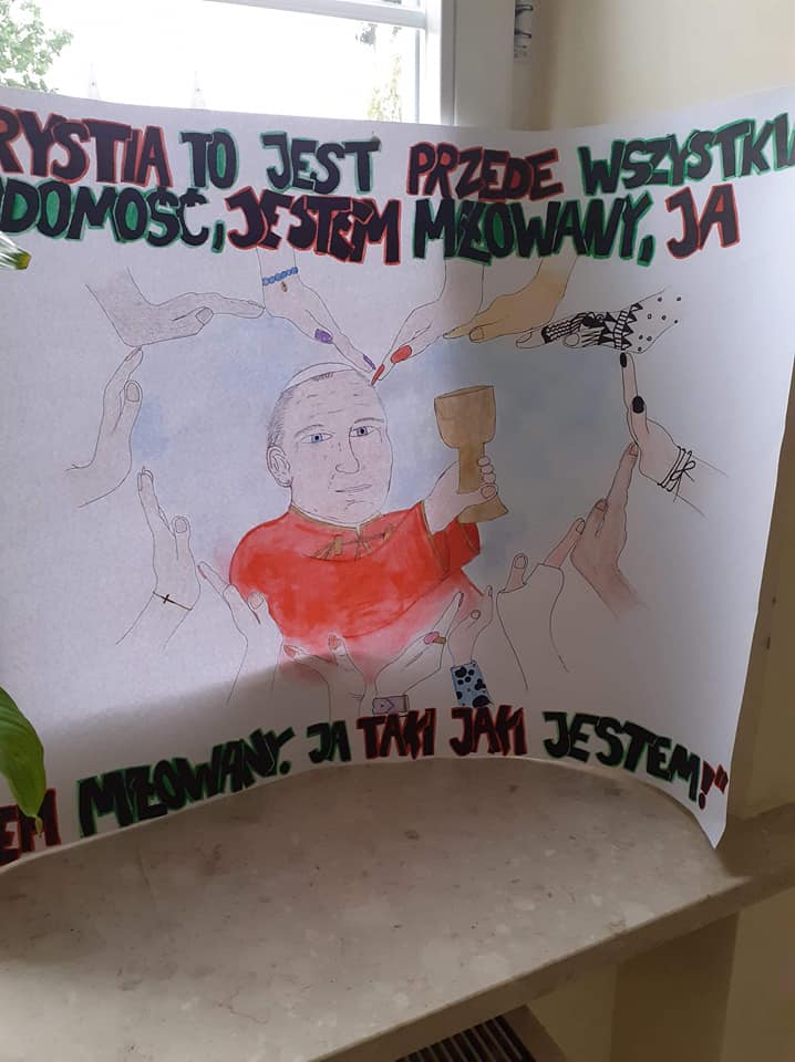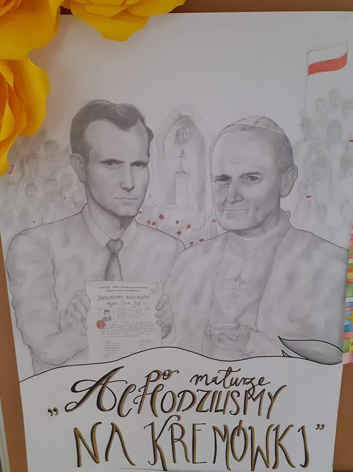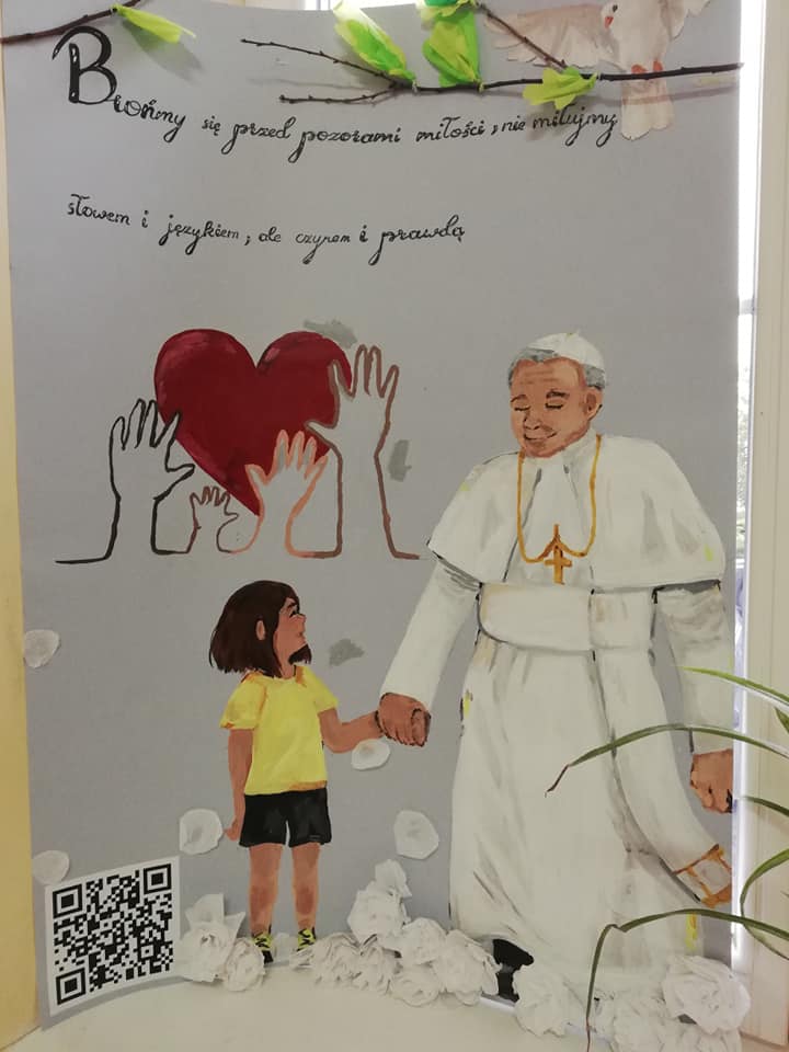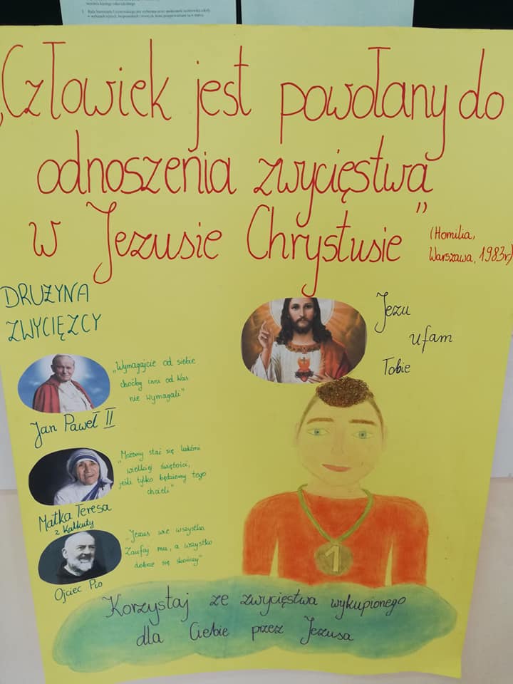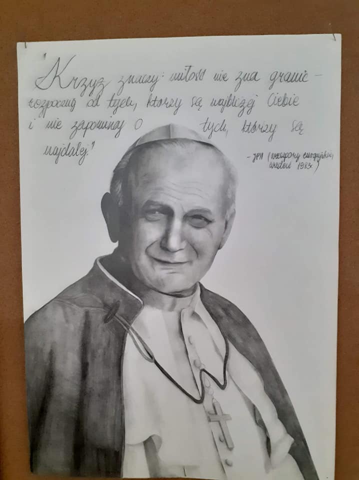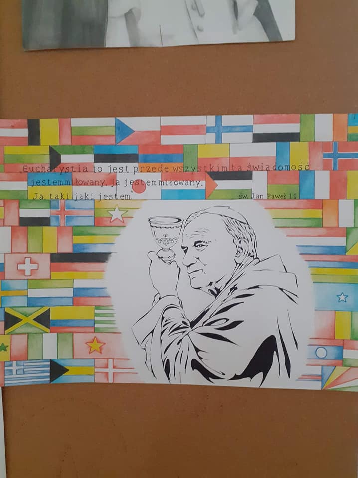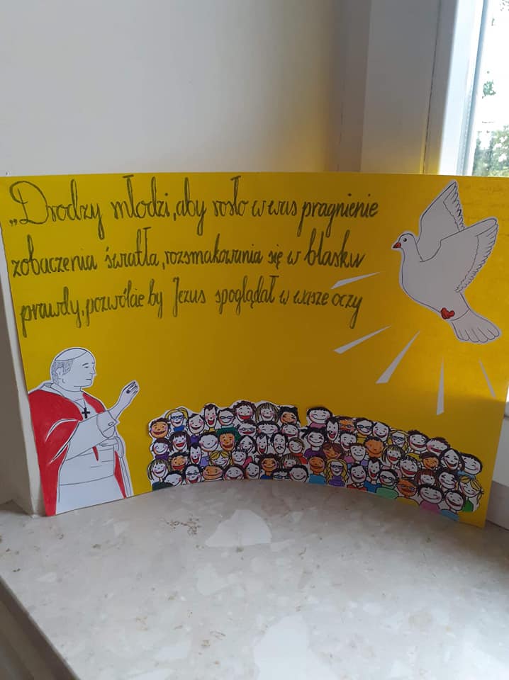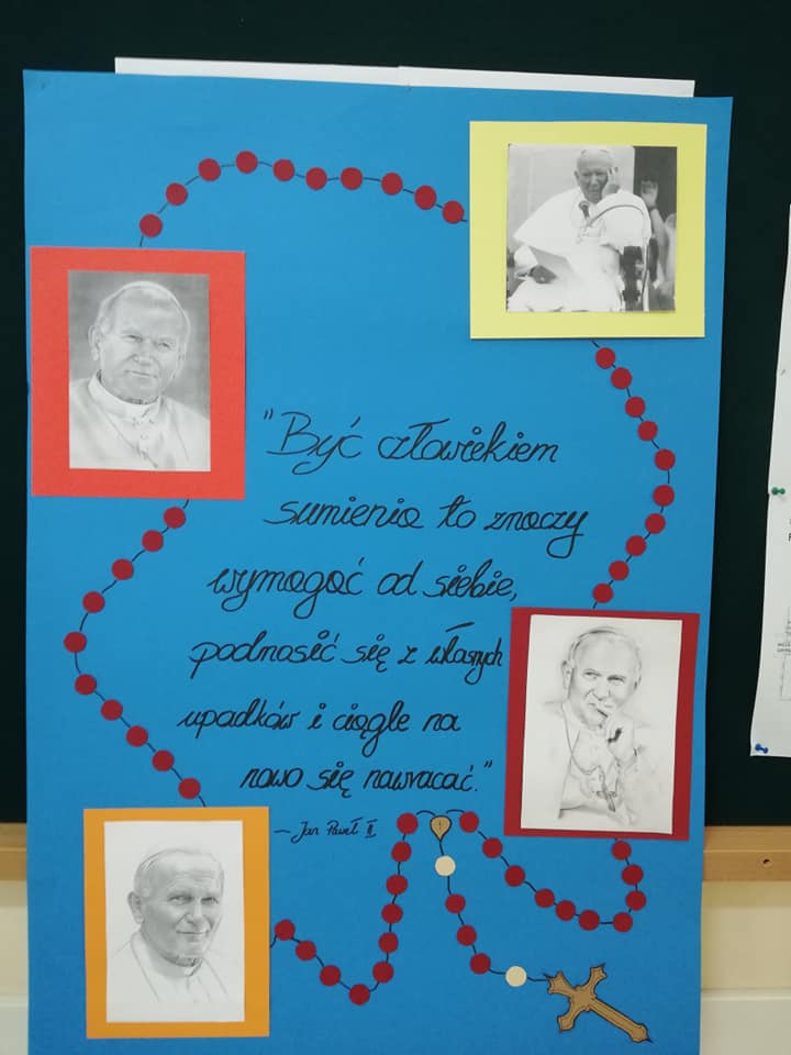 W naszej szkole świętując Dzień Papieski uczniowie pod kierunkiem księży Macieja i Mariana oraz katechetki p. Doroty Krasińskiej przygotowali dekoracje i plakaty, które zdobią szkolne korytarze. W ten szczególny sposób uczciliśmy pamięć o Janie Pawle II.