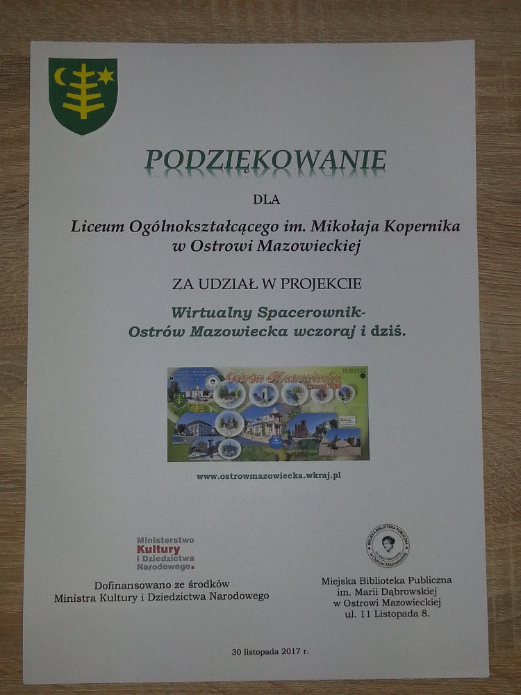 W czwartek, 30 listopada 2017r., w ostrowskim Ratuszu odbyło się podsumowanie projektu „Wirtualny Spacerownik – Ostrów Mazowiecka”. W spotkaniu uczestniczyły panie; Monika Kuziak, Maria Wesołkowska, Anna Rawa – Sadowska oraz uczniowie klasy II f, Zofia Krzyżanowska i Bartosz Jary, którzy reprezentowali grupę wolontariuszy z naszej Szkoły.