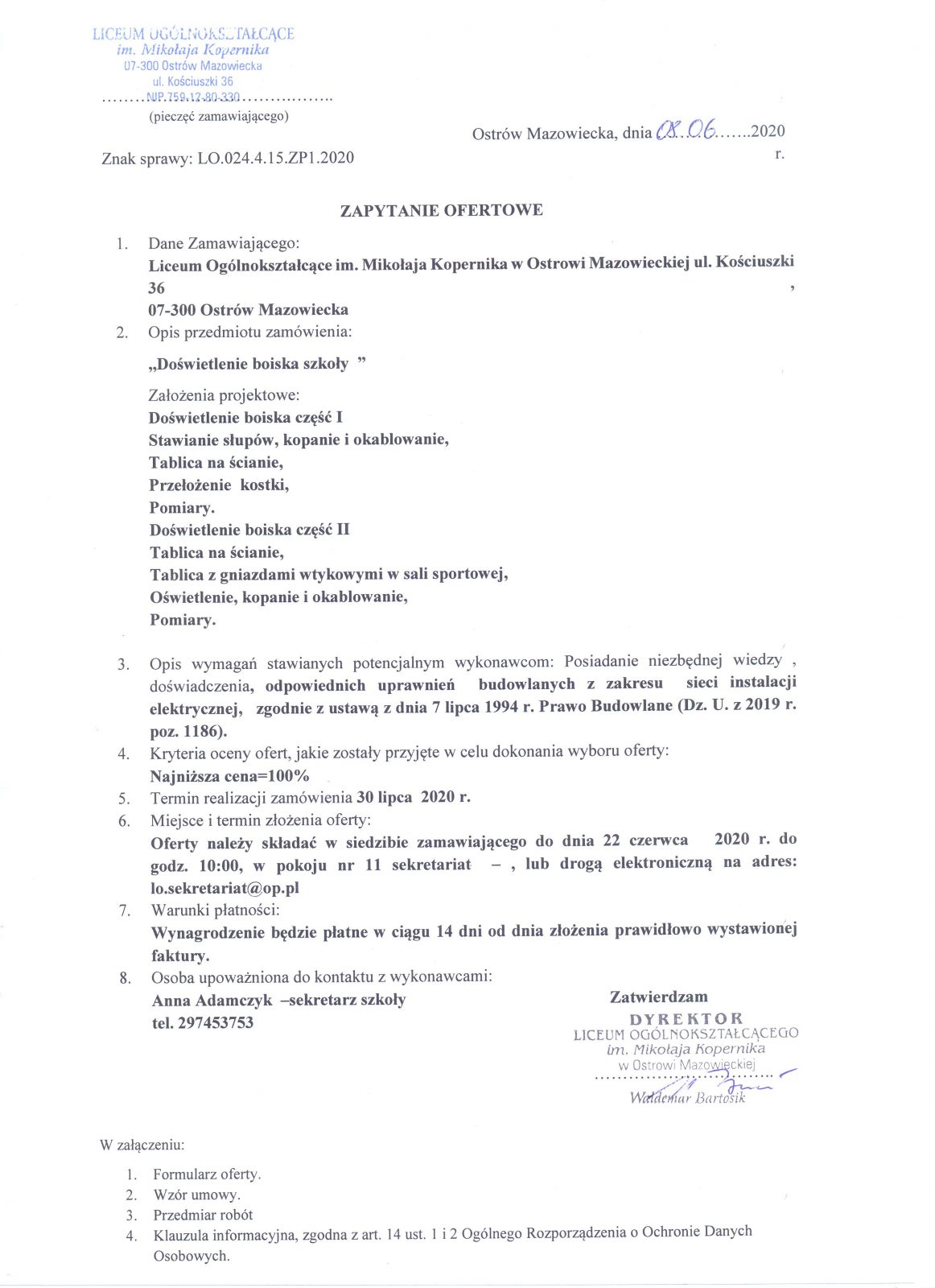 Zapytanie ofertowe „Doświetlenie boiska szkoły” – 8.06.2020