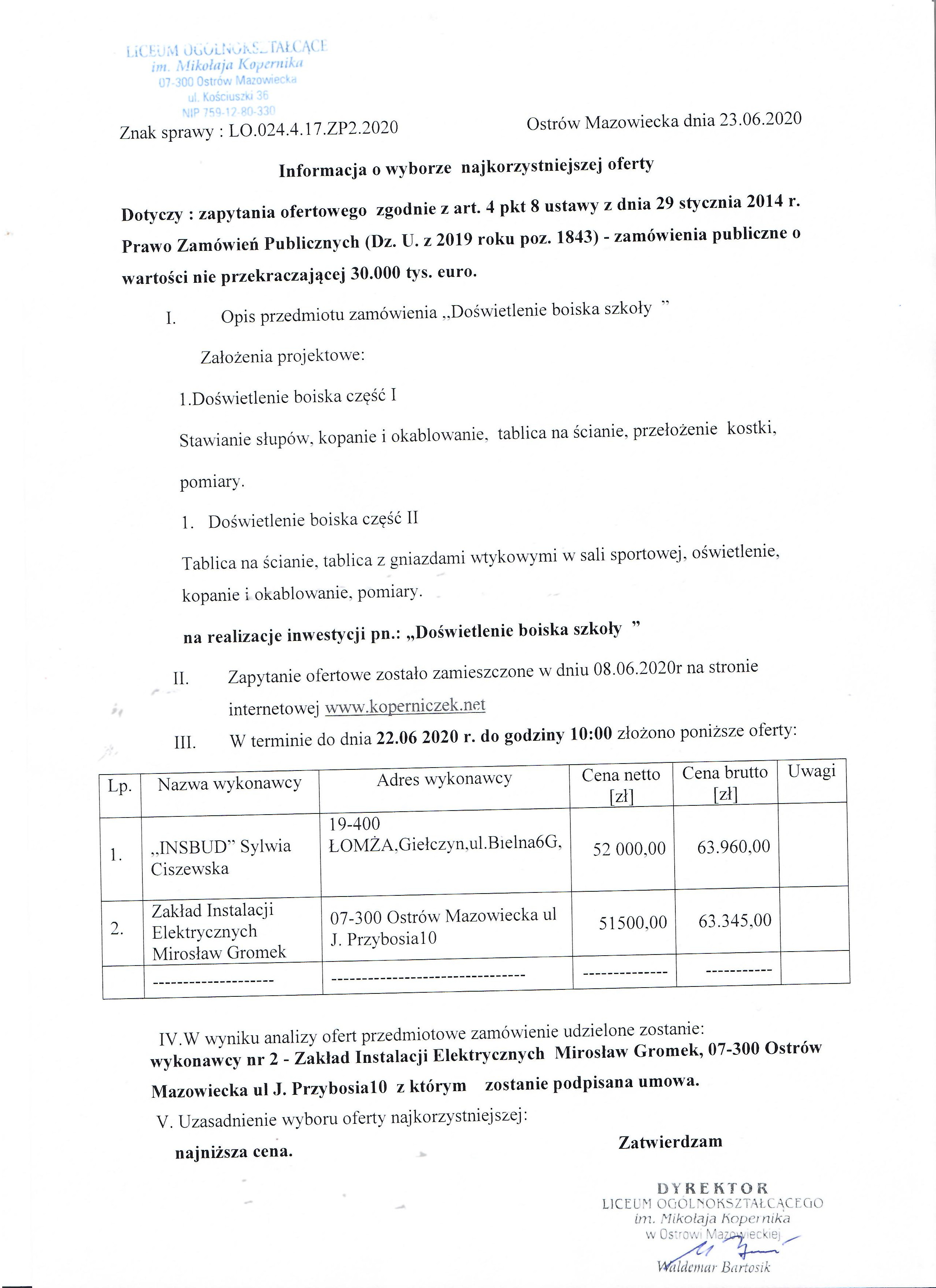 Wybór najkorzystniejszej oferty – 23.06.2020